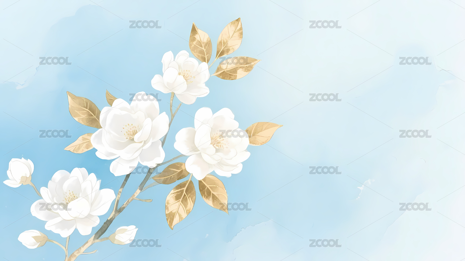 白花金叶水彩背景