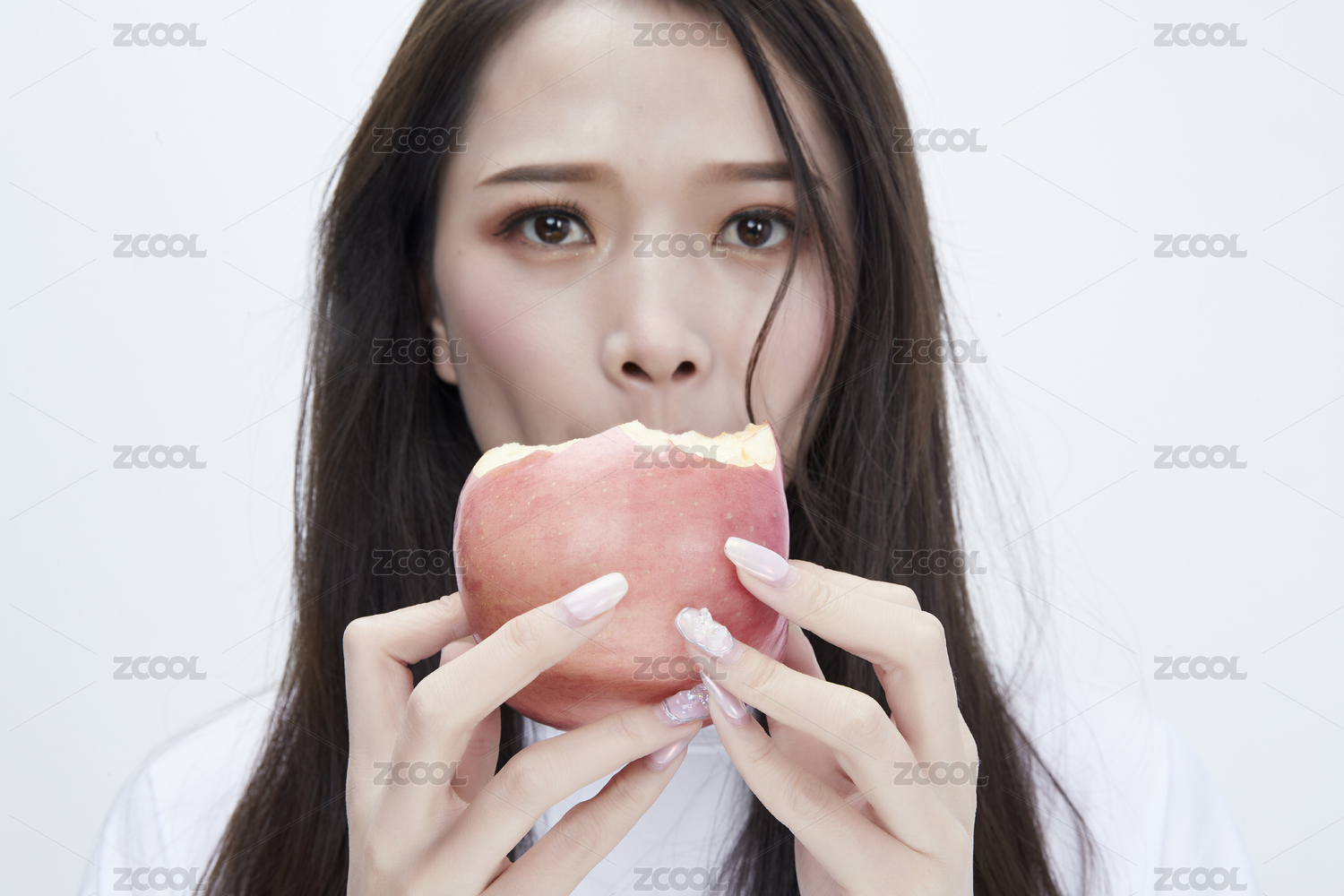 吃苹果的穿白色长T血衫的长发可爱少女人像
