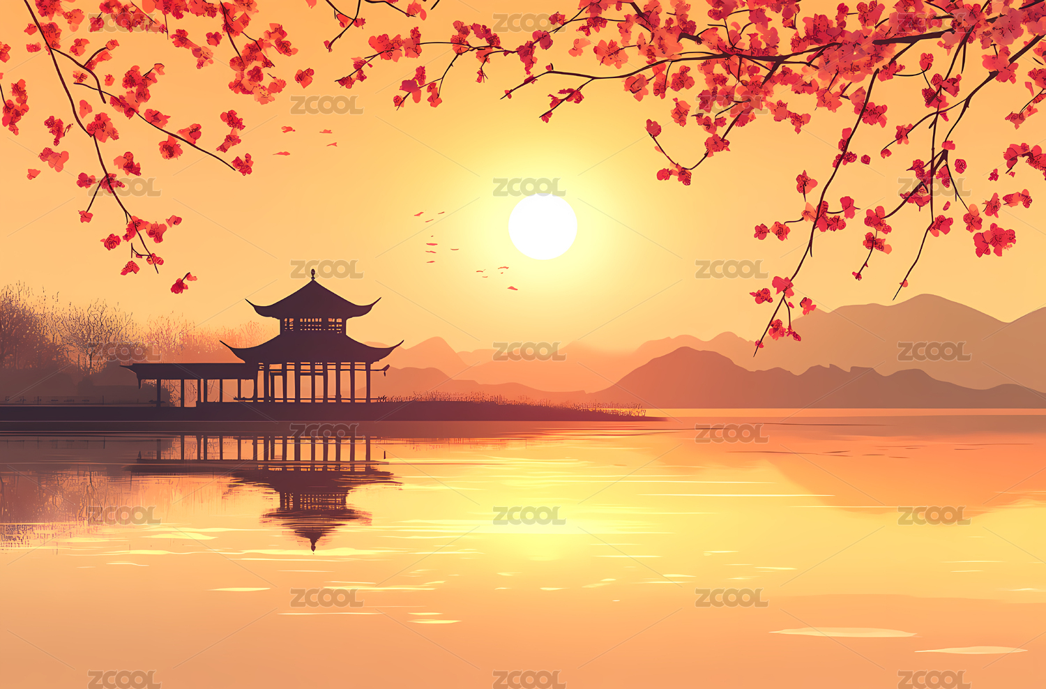 水上亭台日落宁静风光