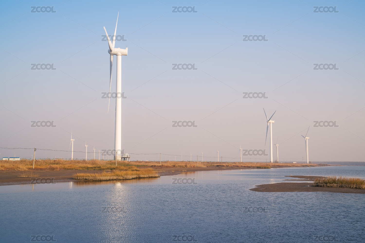 上海横沙岛上耸立在江边的风力发电机
