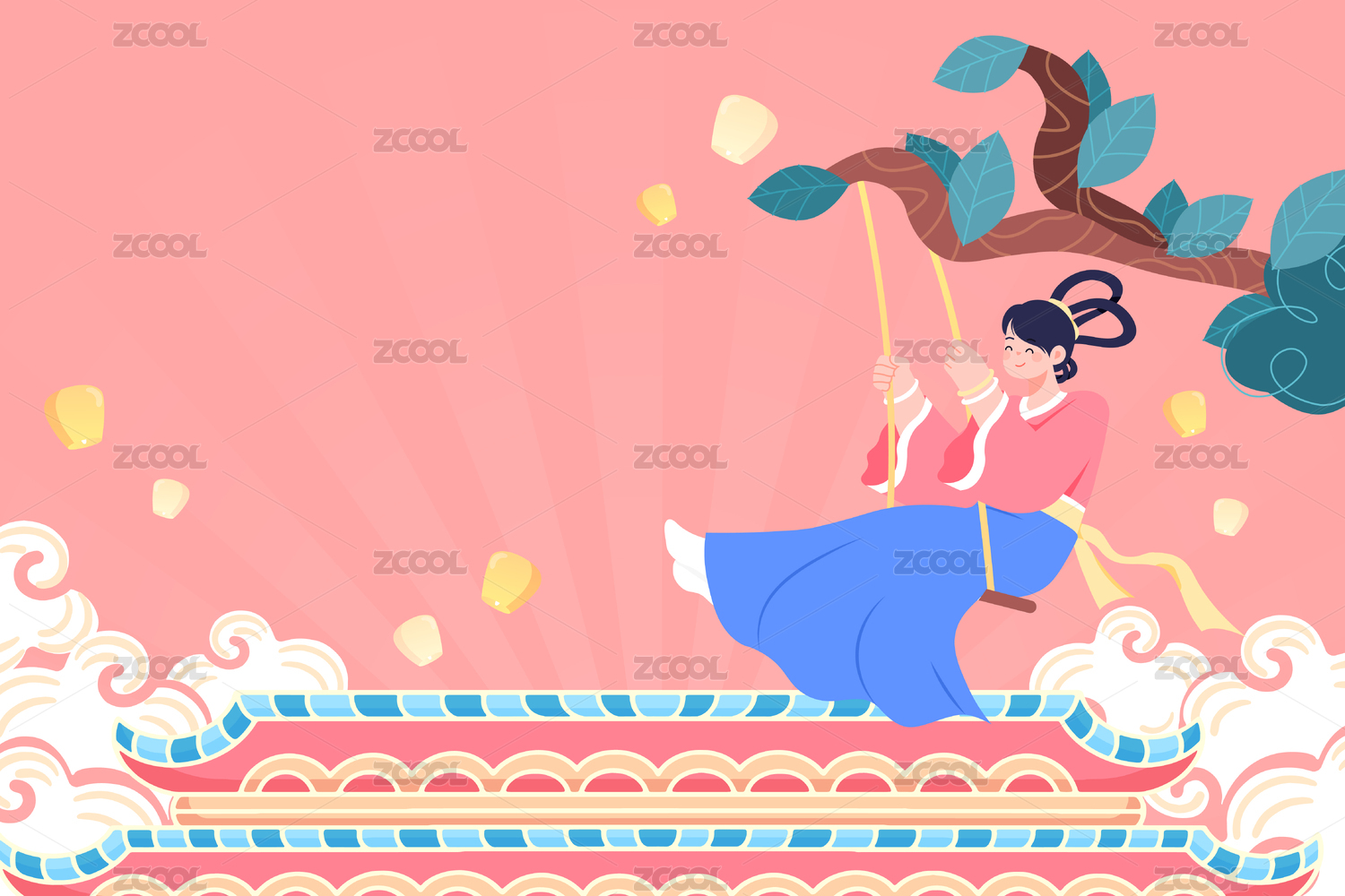 河南省插画唐风侍女牡丹花老君山洛阳宫灯