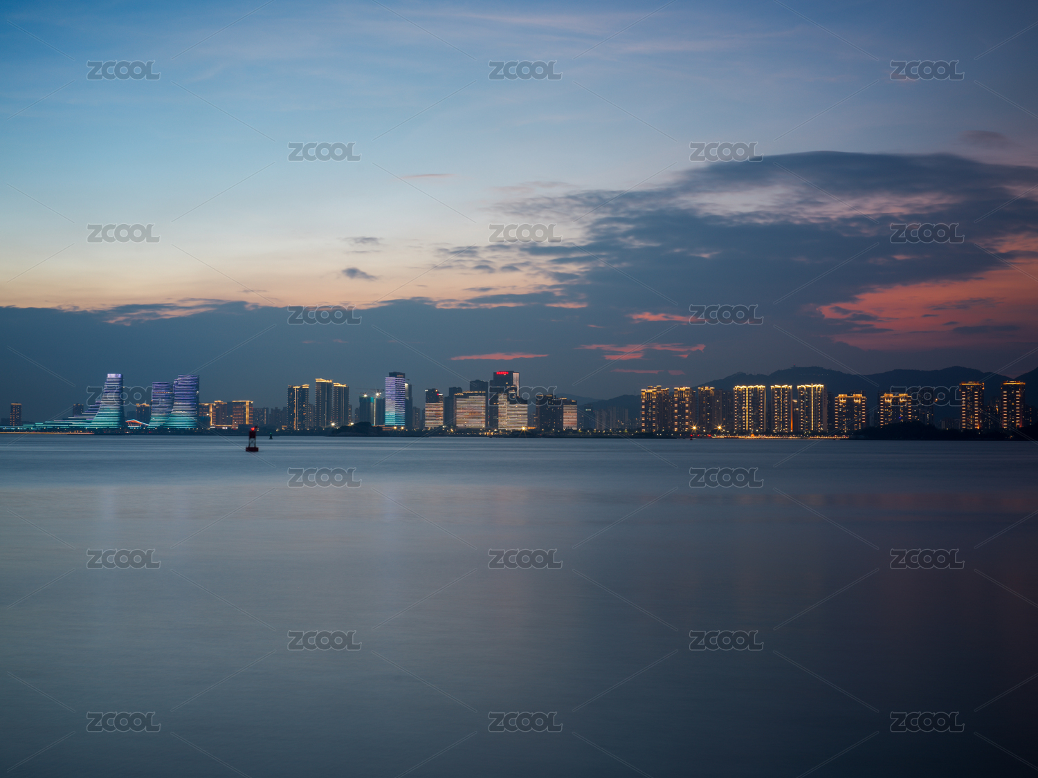 厦门海湾公园城市天际线在黄昏时的风景