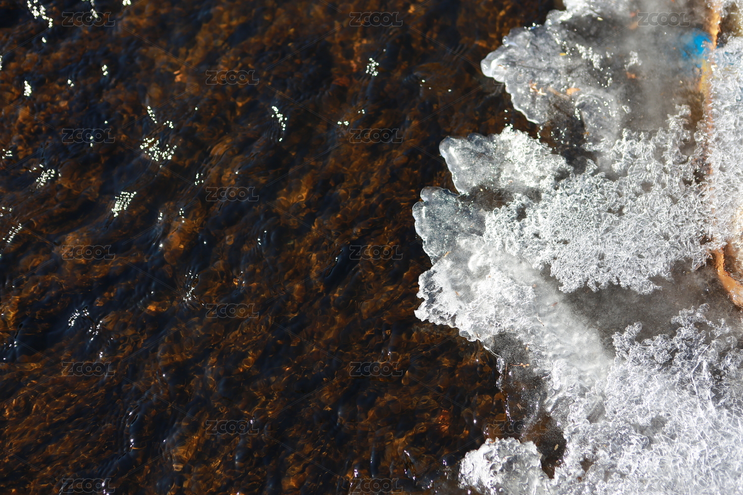 冬天冰冻的湖面, 反光蓝色的冰和芦苇, 环境气候