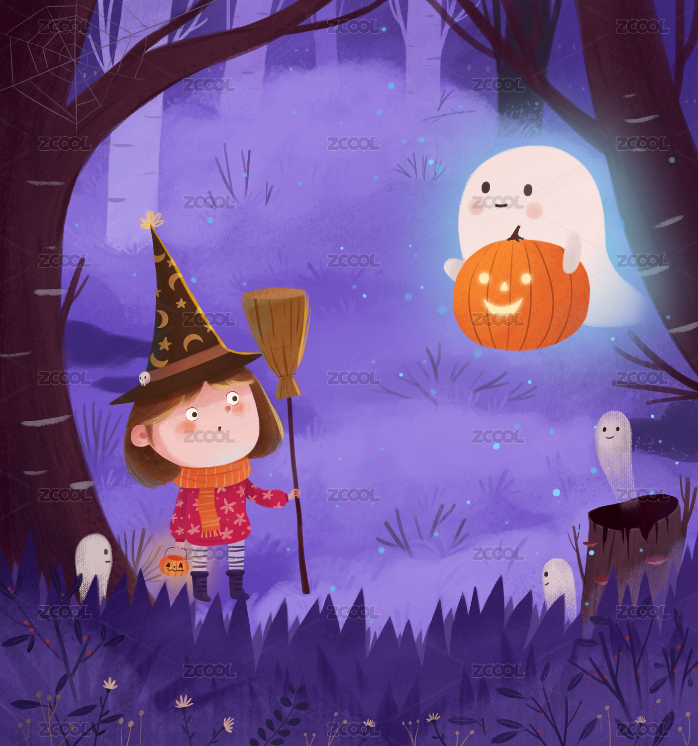 万圣节小女孩鬼怪幽灵手绘插画