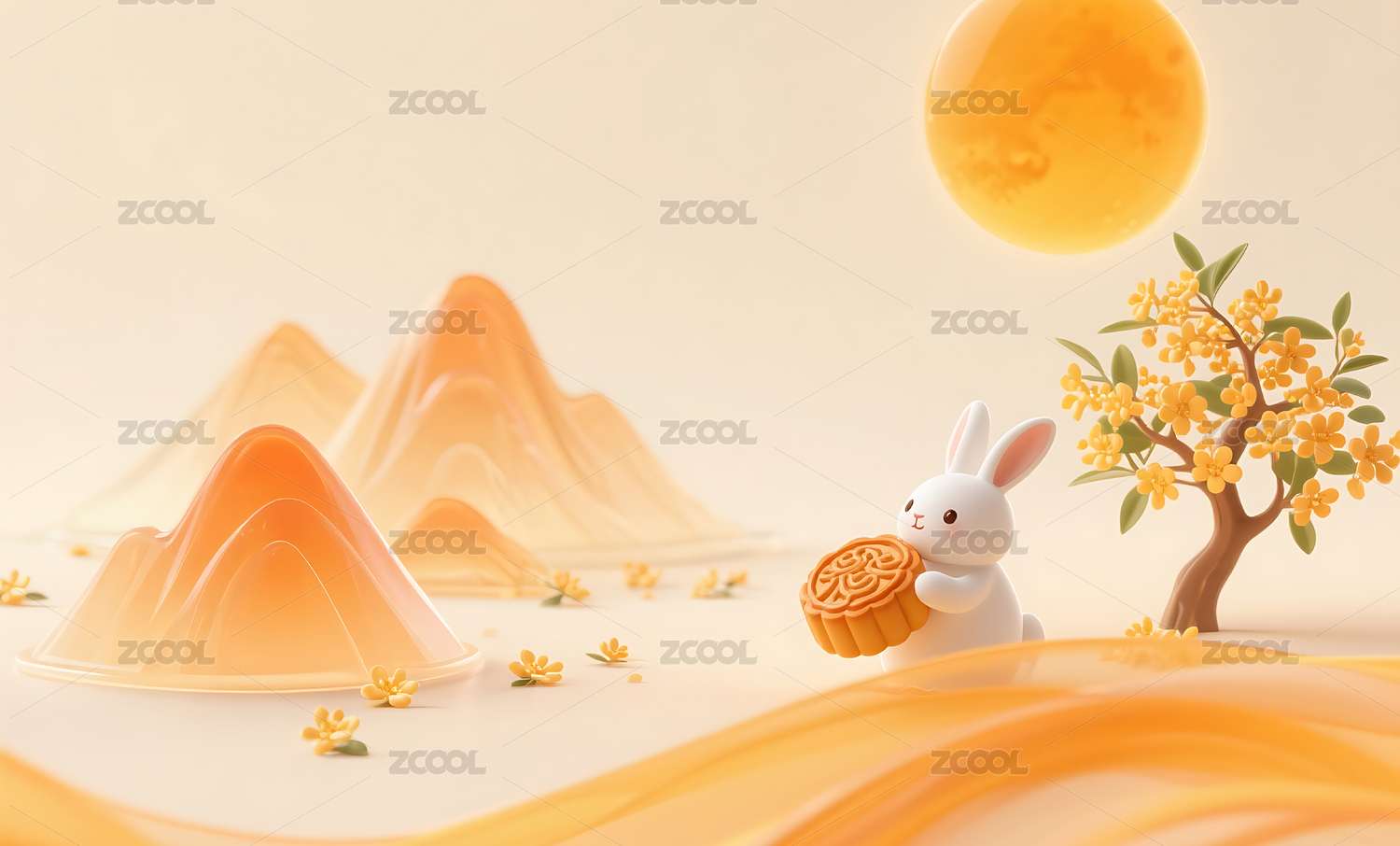 中秋节橙黄色调月亮玉兔桂花丝带飘带背景