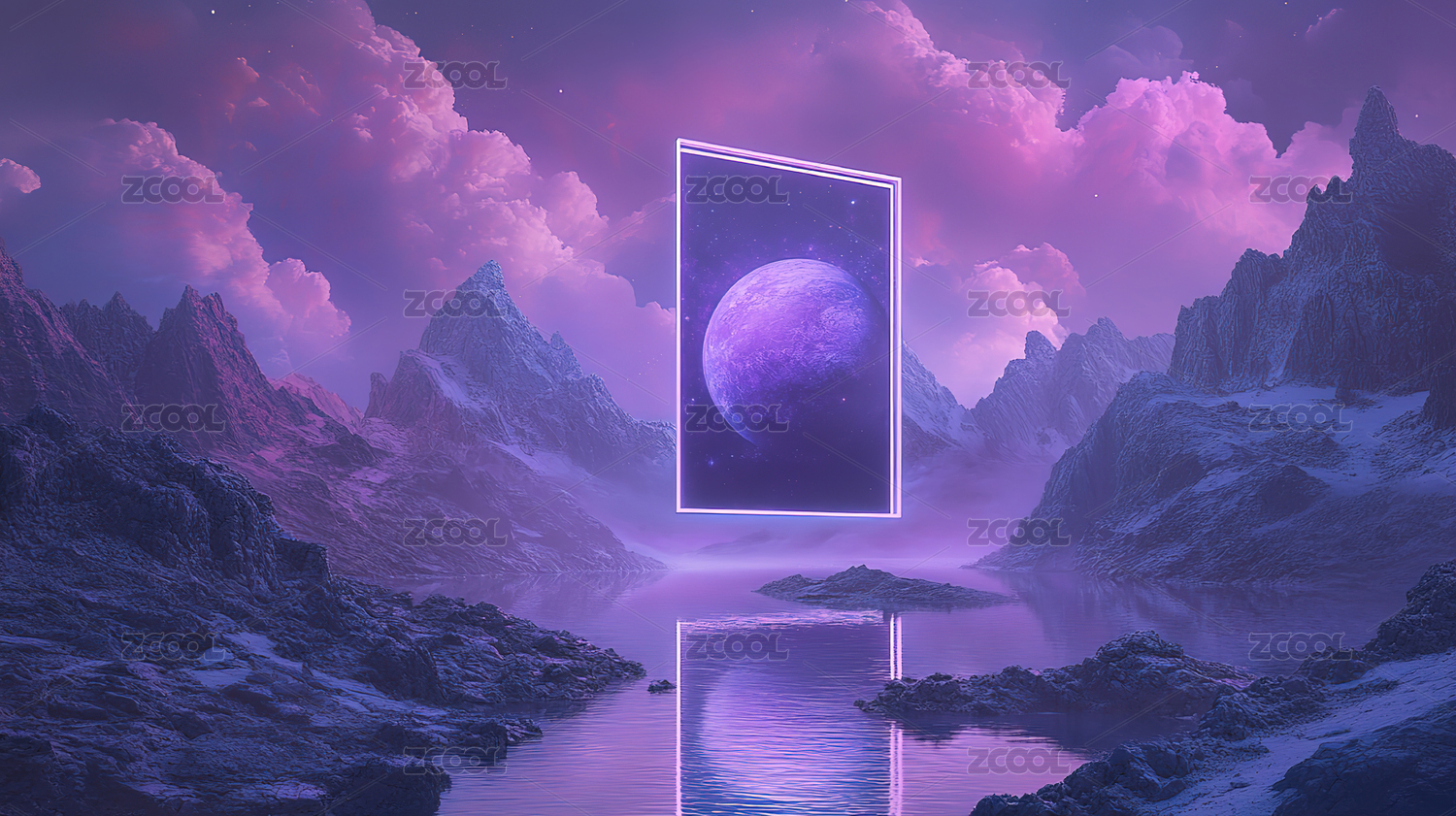 霓虹光框下的虚拟山脉风景