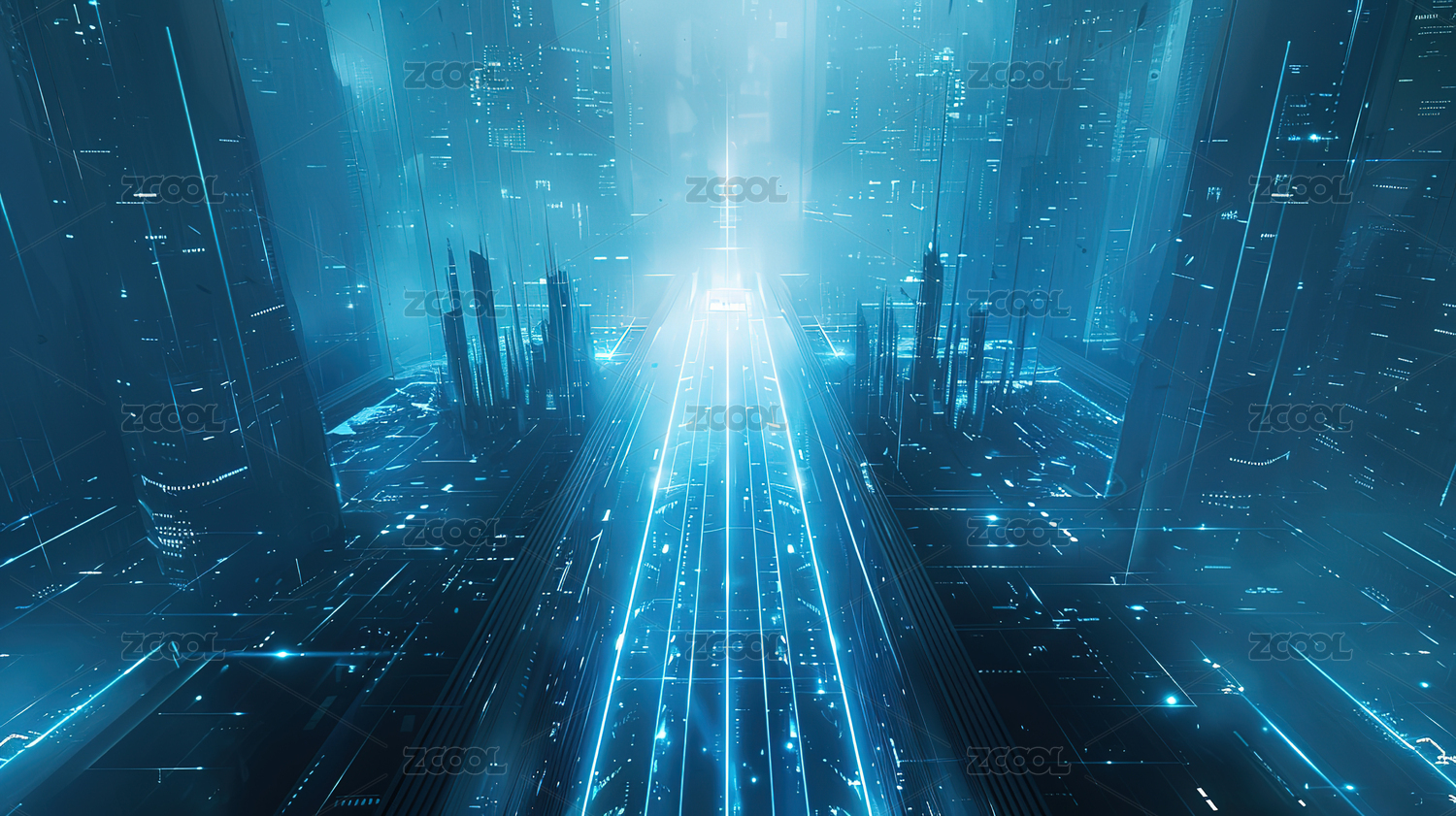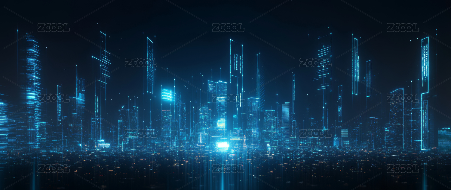 现代城市建筑蓝灯3D技术摩天大楼智能数据