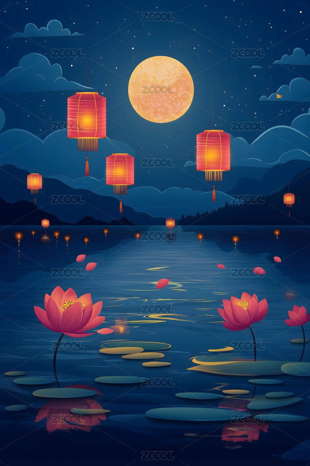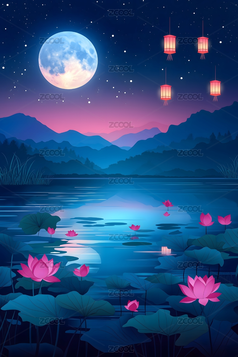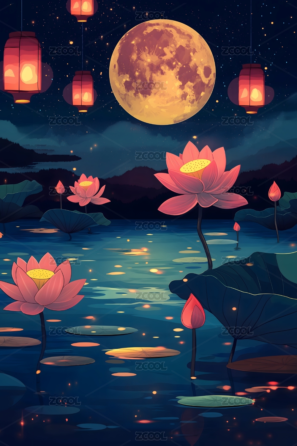 插画,夜晚,月亮,中秋节,荷花,天空,户外,行星,可爱风