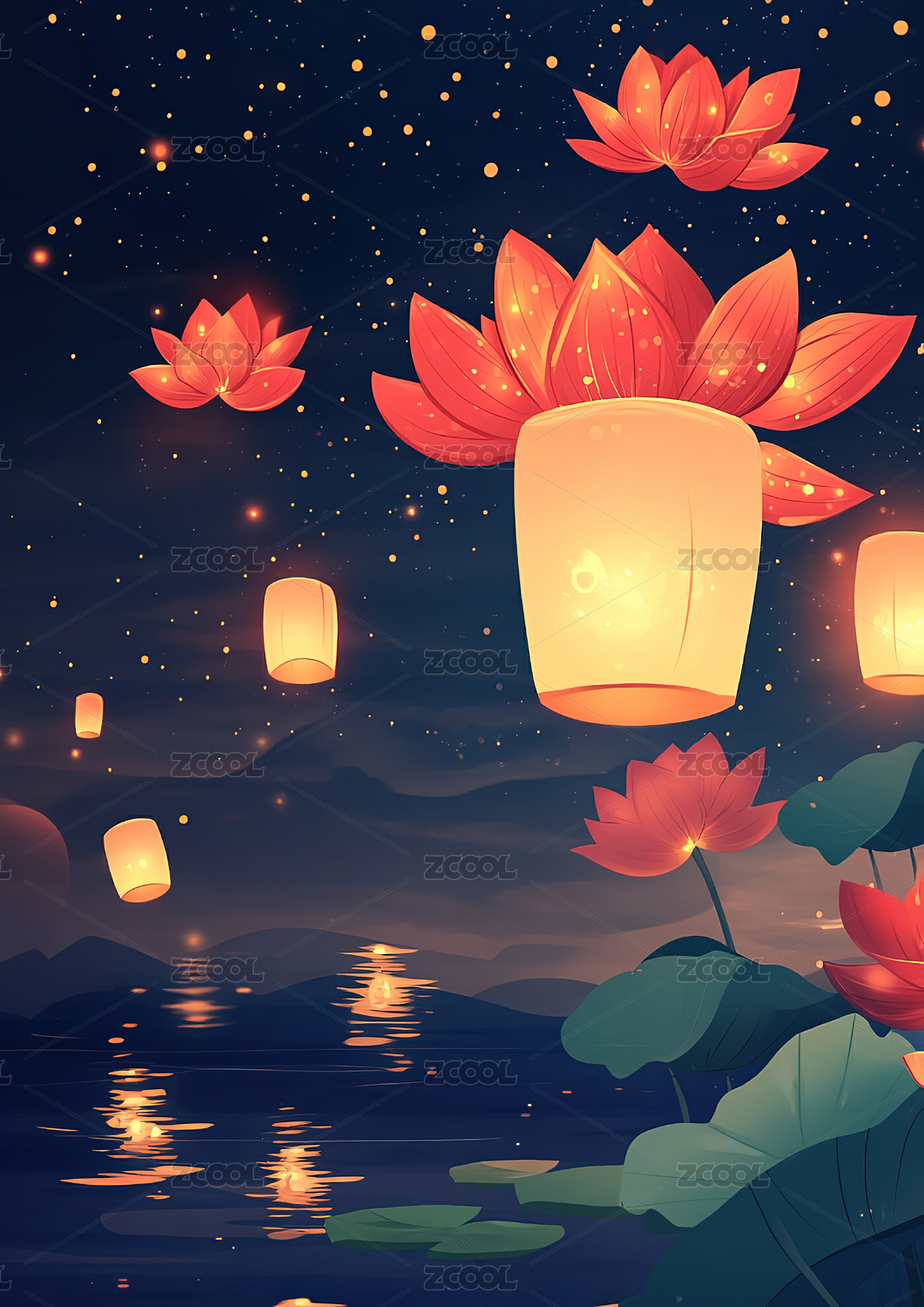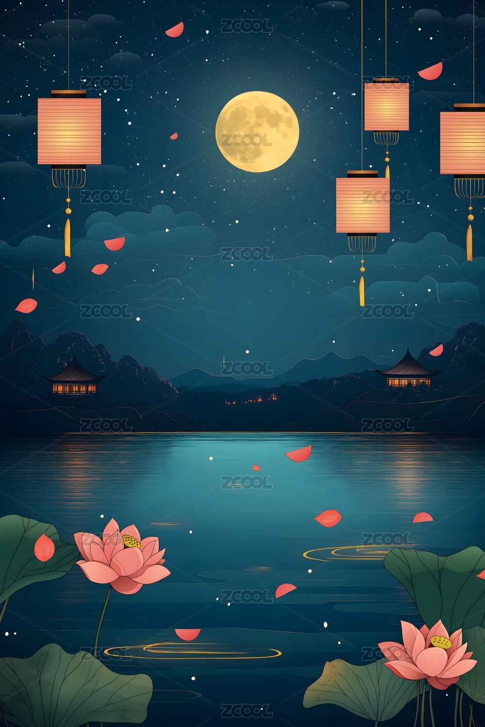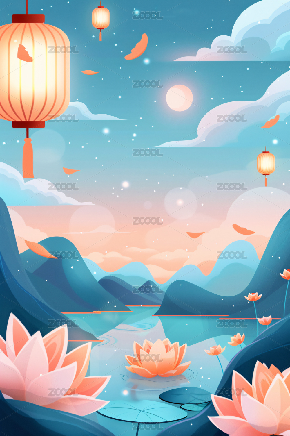 插画,夜晚,月亮,中秋节,荷花,天空,户外,行星,可爱风