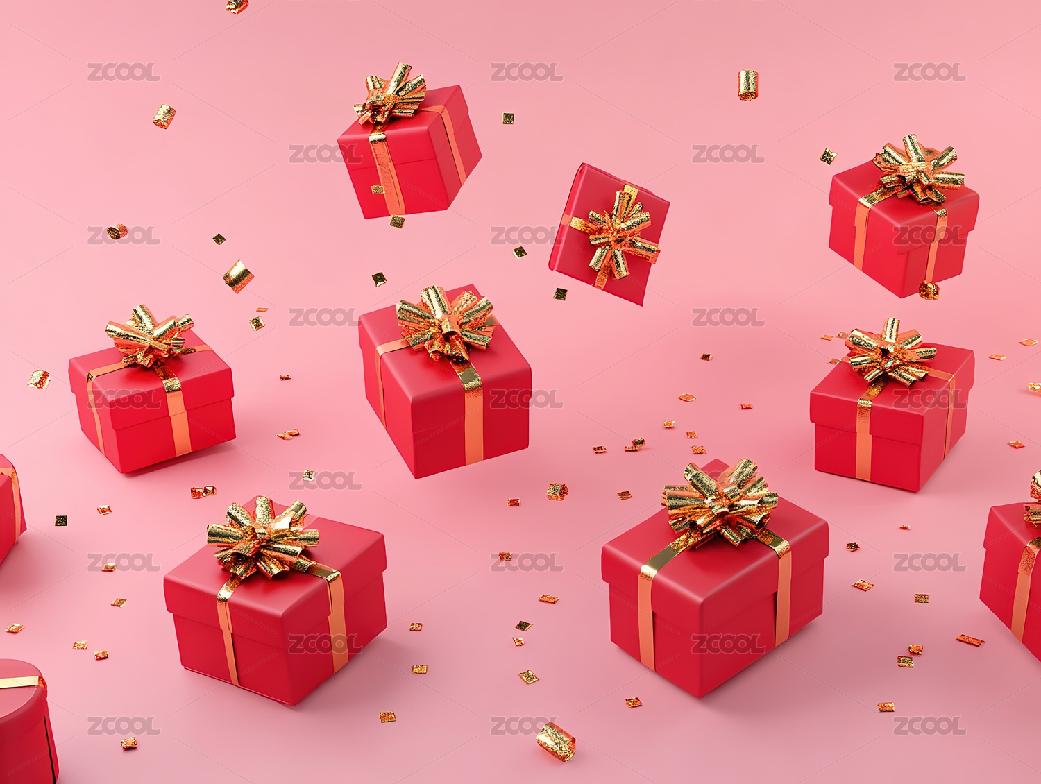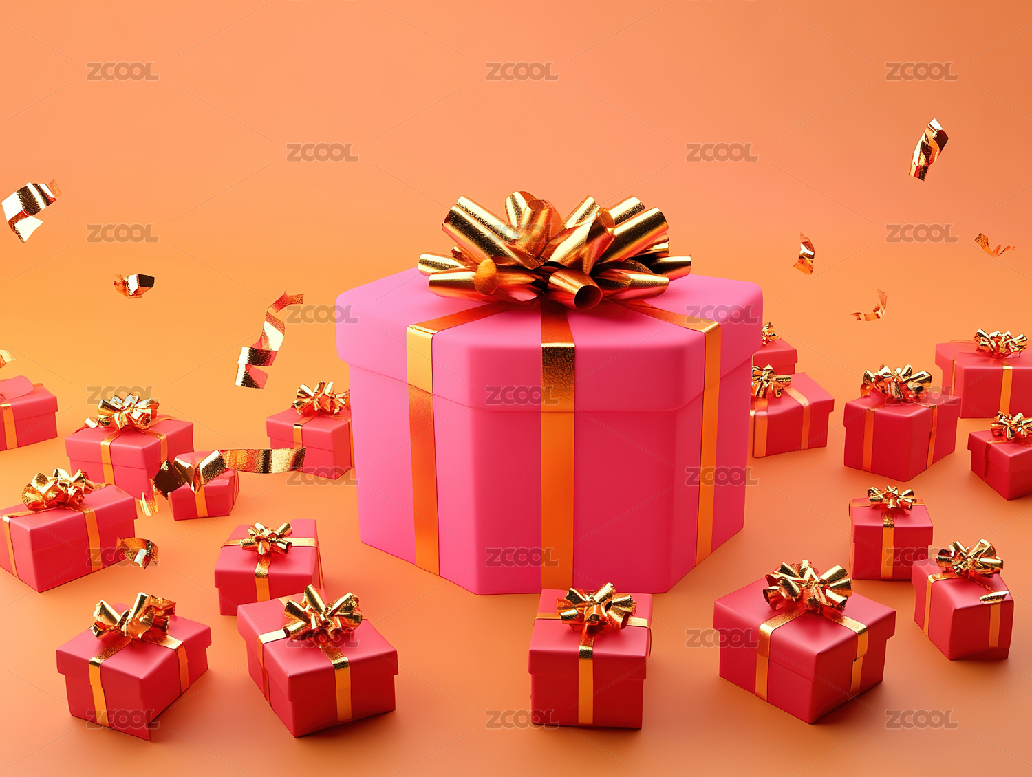 一个粉色礼品盒,周围飘散着各种彩带