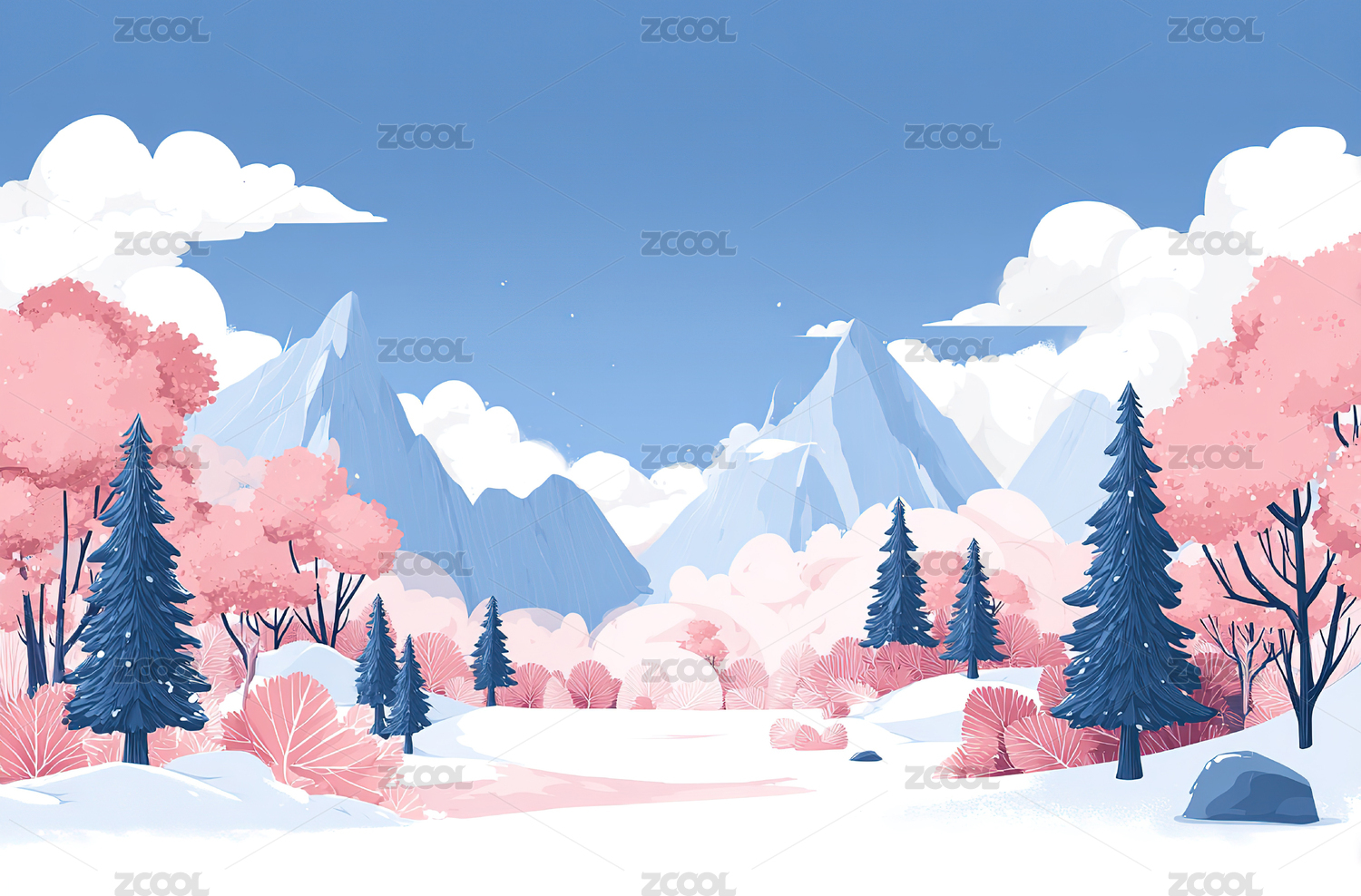 雪景山林与粉红树木