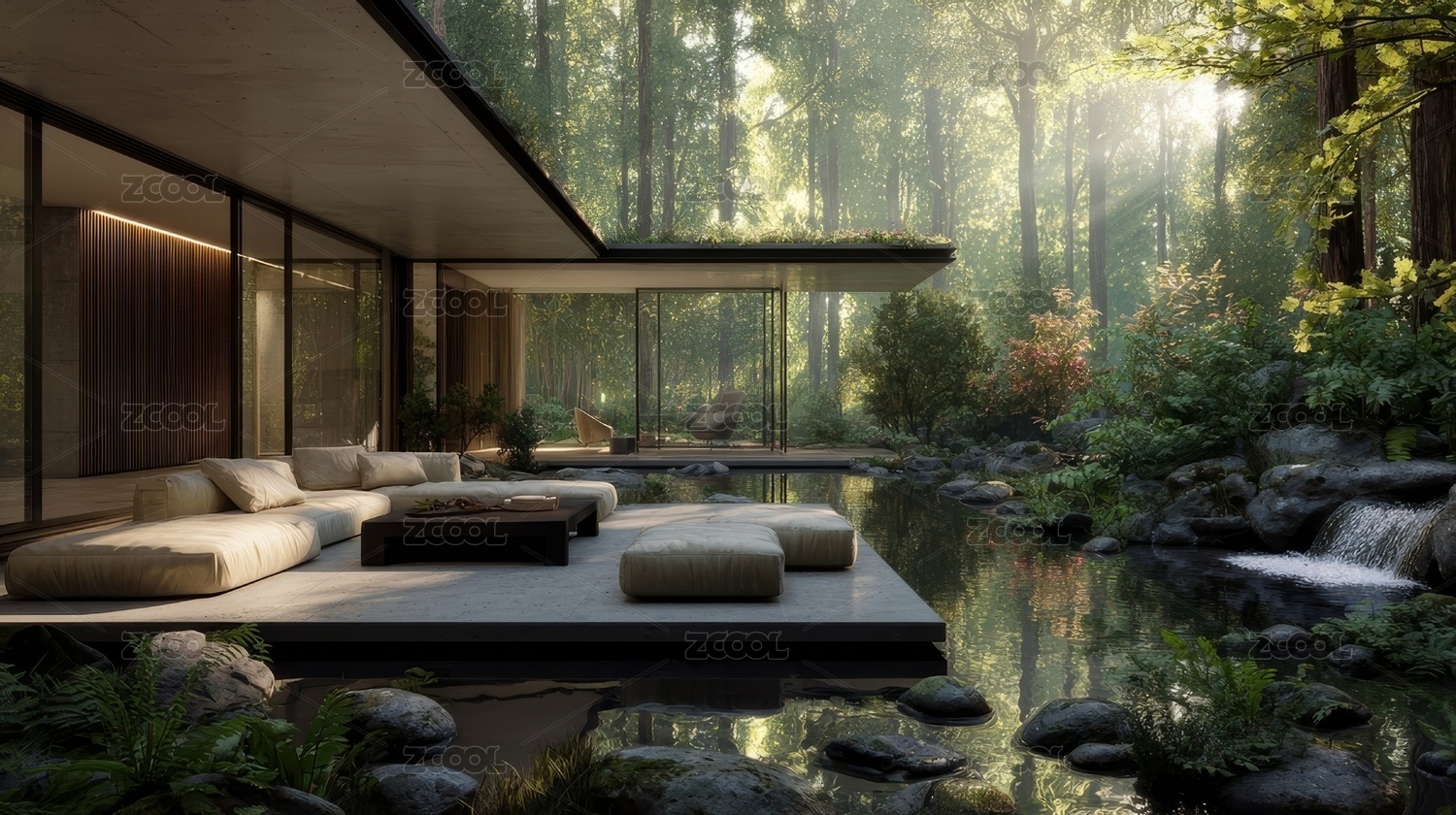 一栋被树木和植物环绕在池塘中央的现代住宅