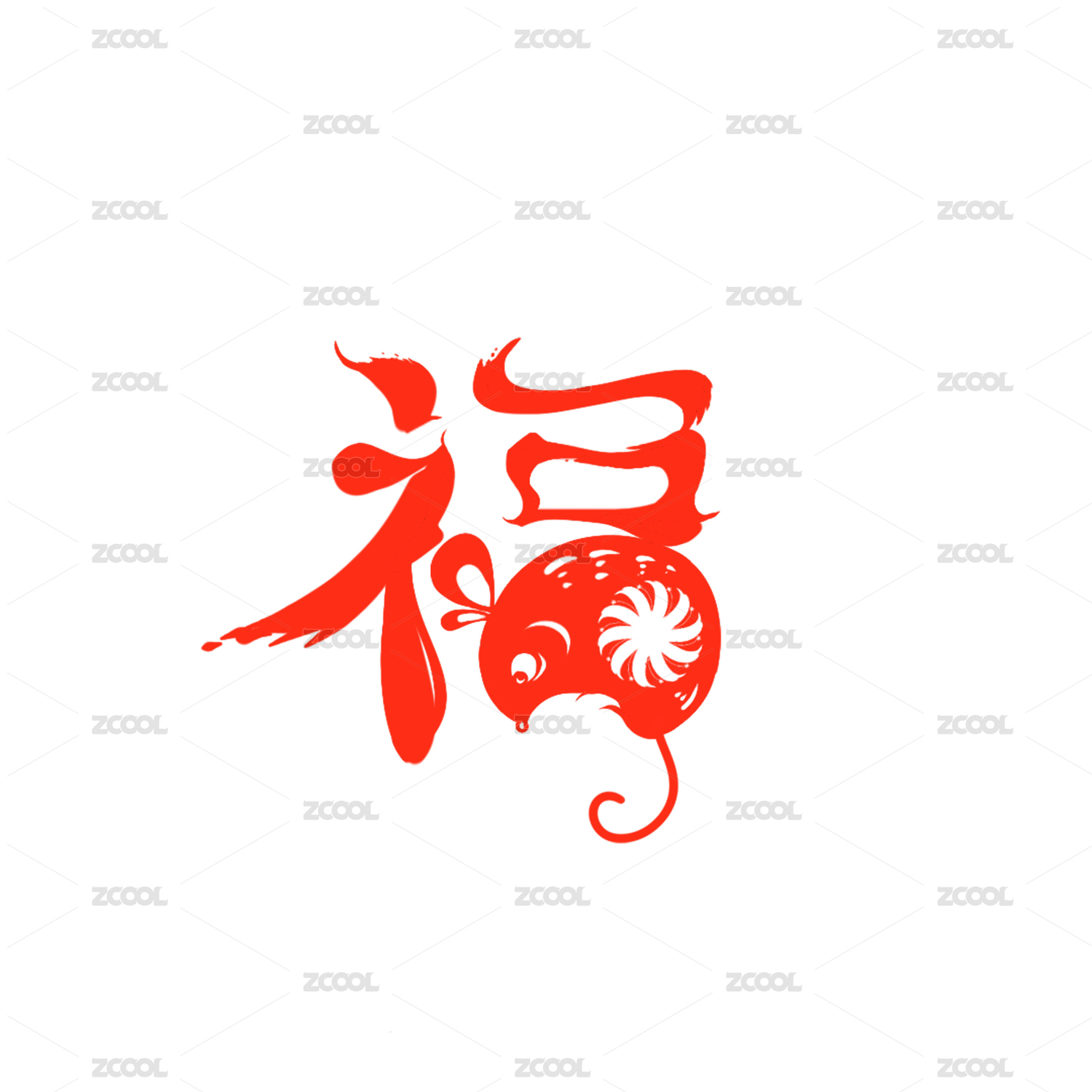 红色的福字里有一个好色的蜷缩着的老鼠,喜庆的新年福字。
