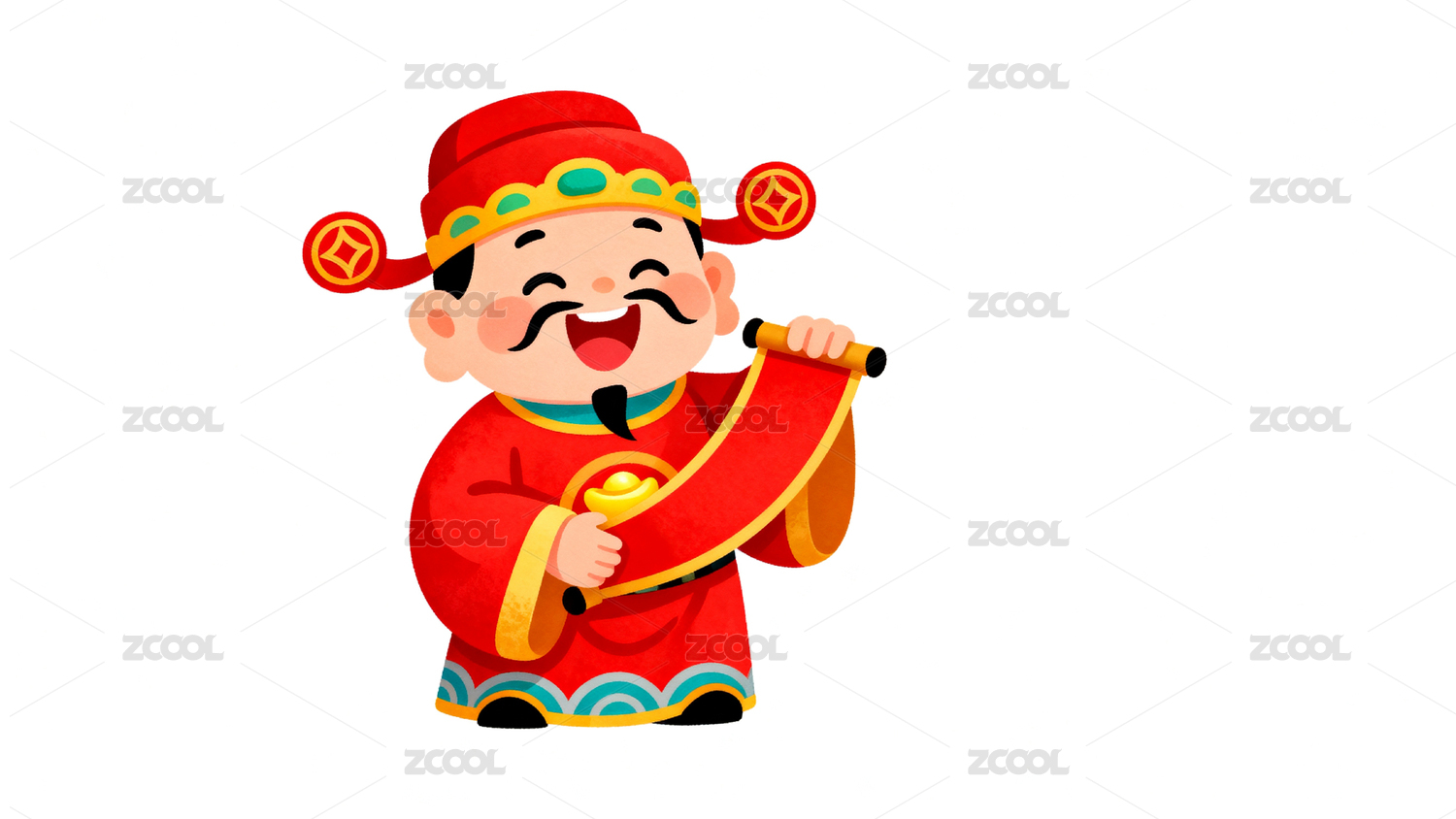 卡通财神爷手持卷轴笑容满面