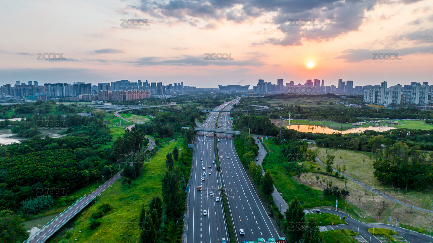 成都高新区环球中心锦城湖绕城高速日出航拍