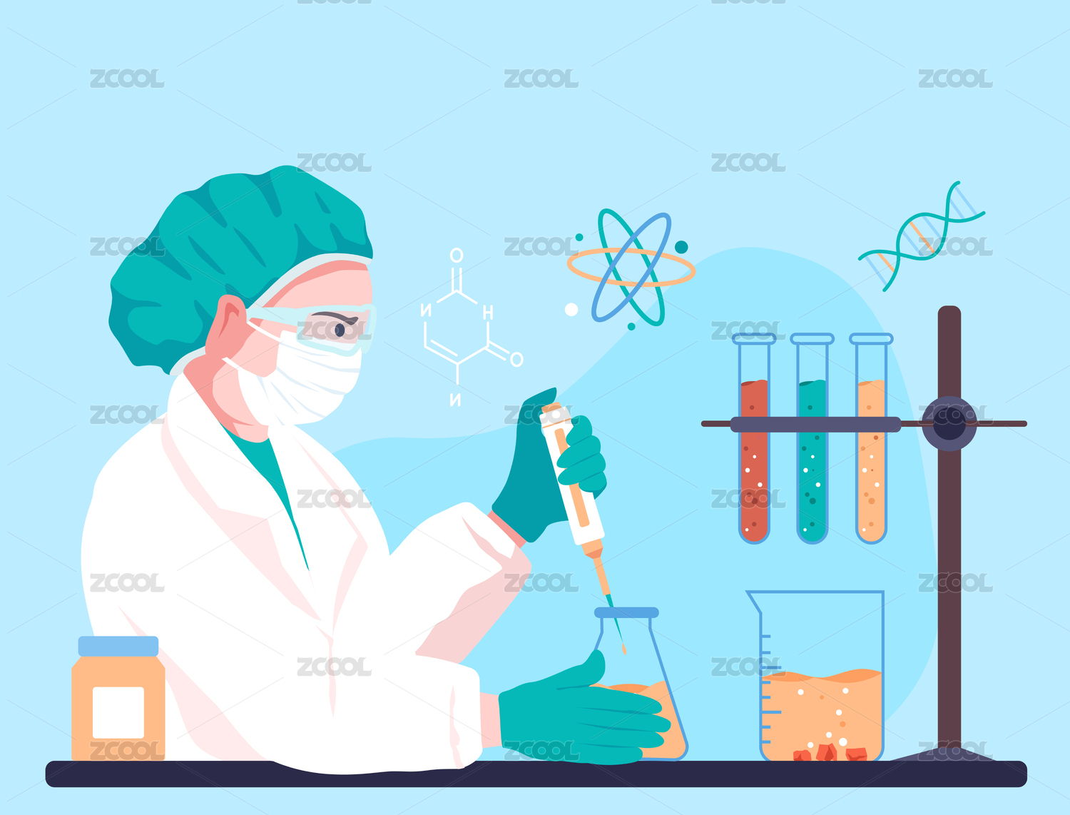 卡通手绘戴口罩医护人员手持化学瓶子插画