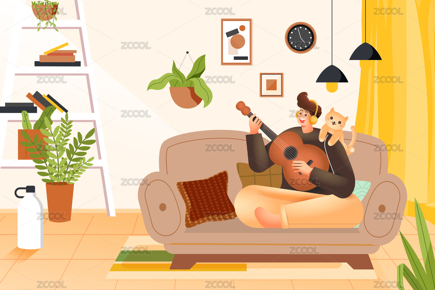 卡通,手绘,插画,素材,元素,背景,看书,听音乐,阅读,休闲