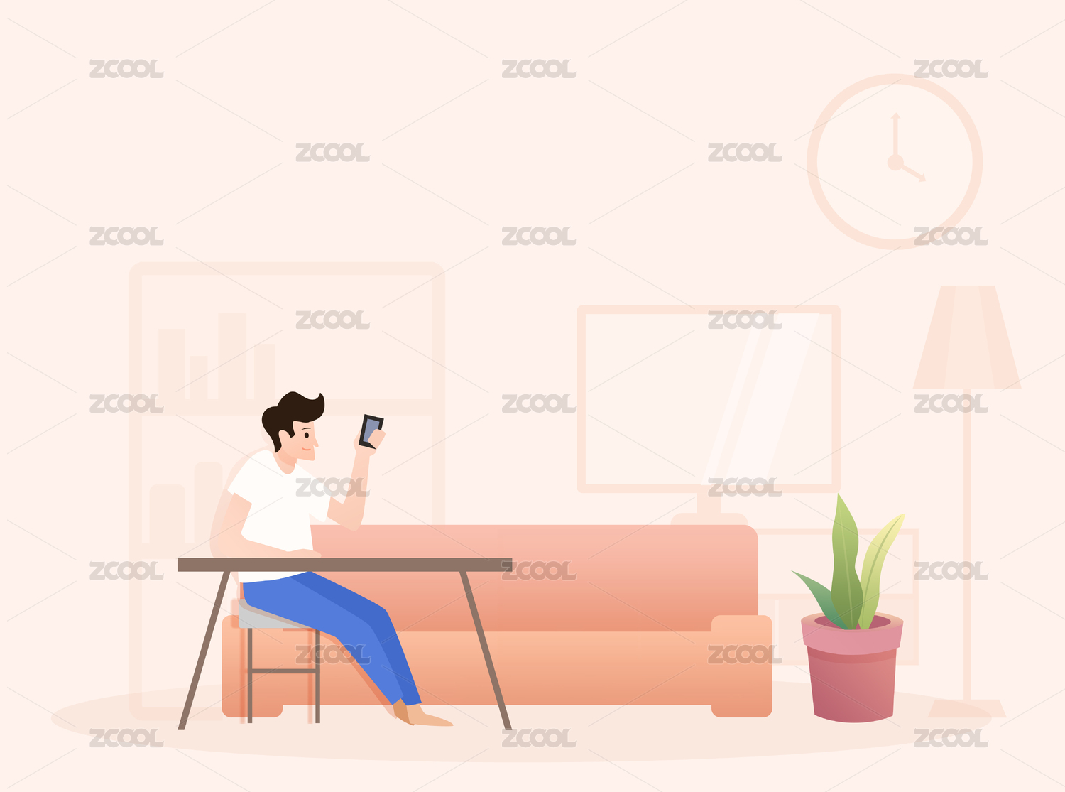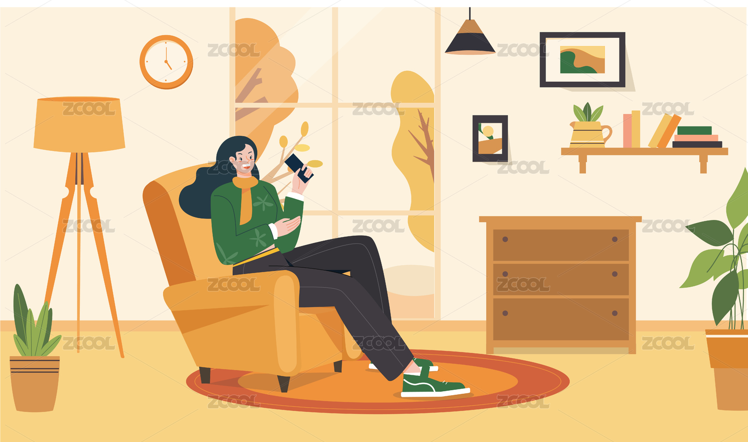 女孩沙发喝咖啡玩手机矢量插画