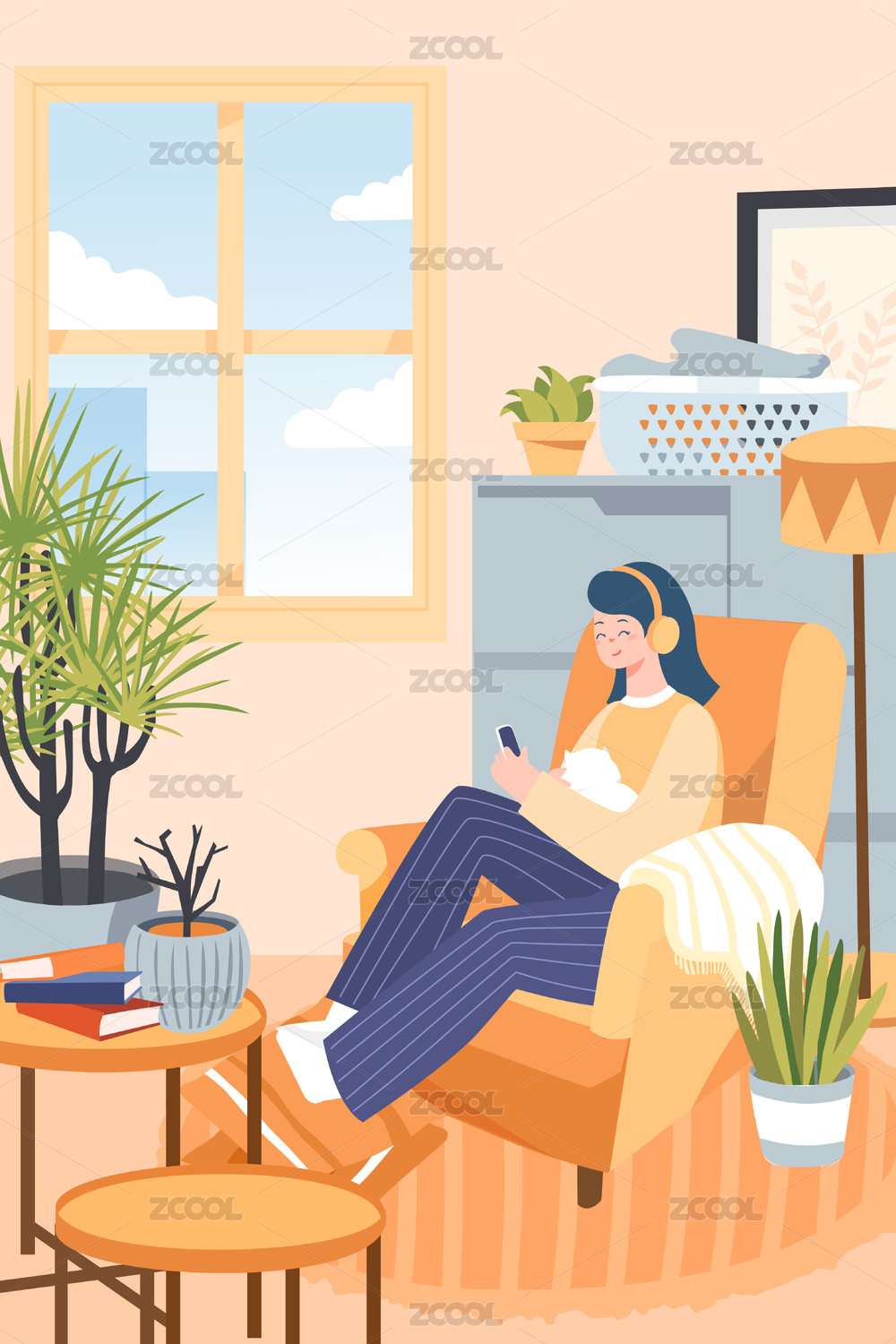 女孩宅家矢量插画