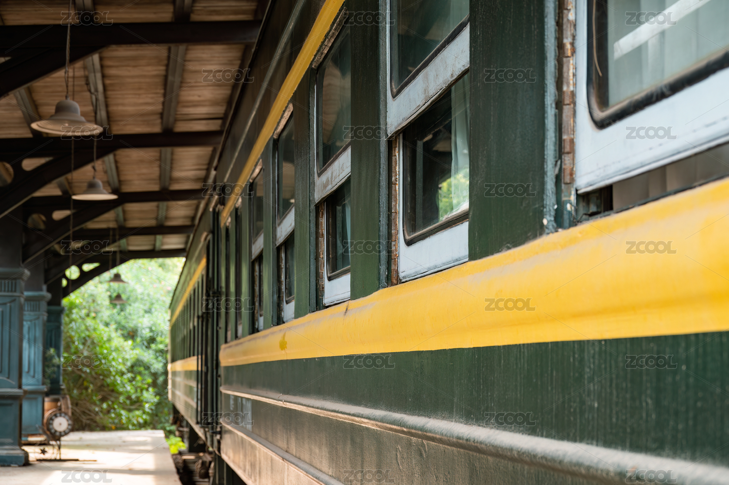 停靠在复古风格站台上的老式绿皮火车