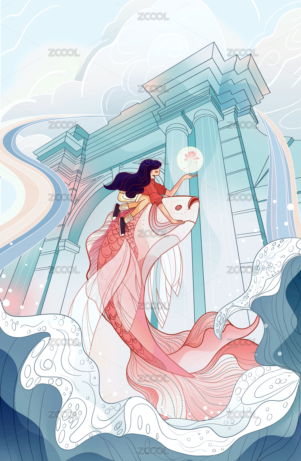 中国古风水墨微观山水场景女孩满载一船鲜花