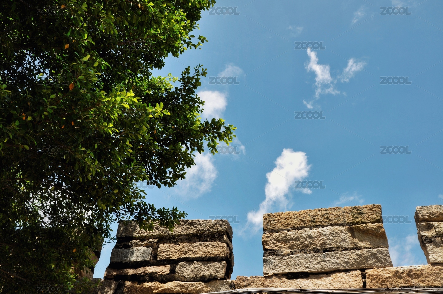 蓝天白云下一堵带铁丝网长满爬山虎的高高的围墙,中国福建龙岩