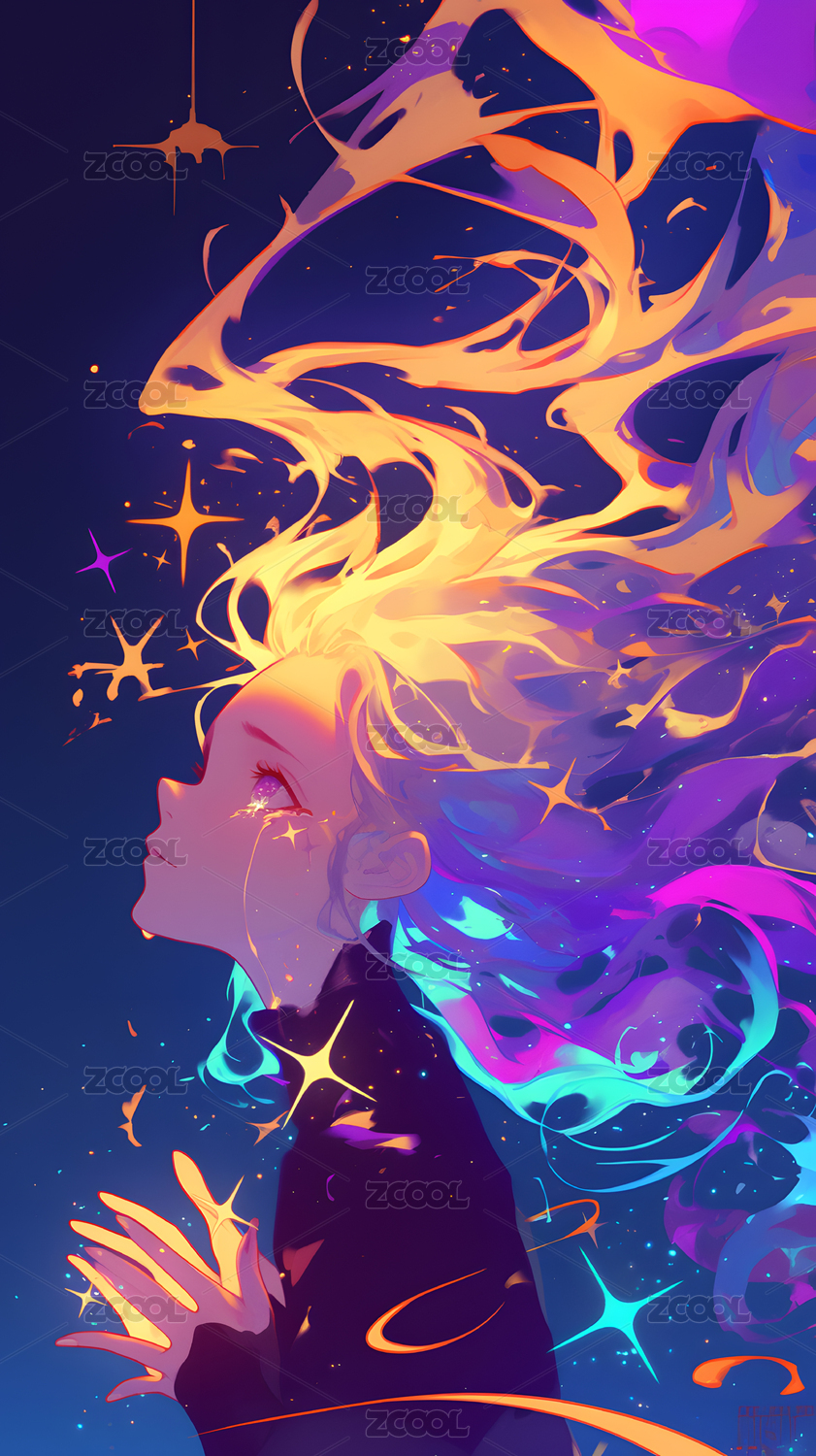 华丽,女孩,插画,二次元,梦幻,动漫,绘画,夜空,烟雾,星星