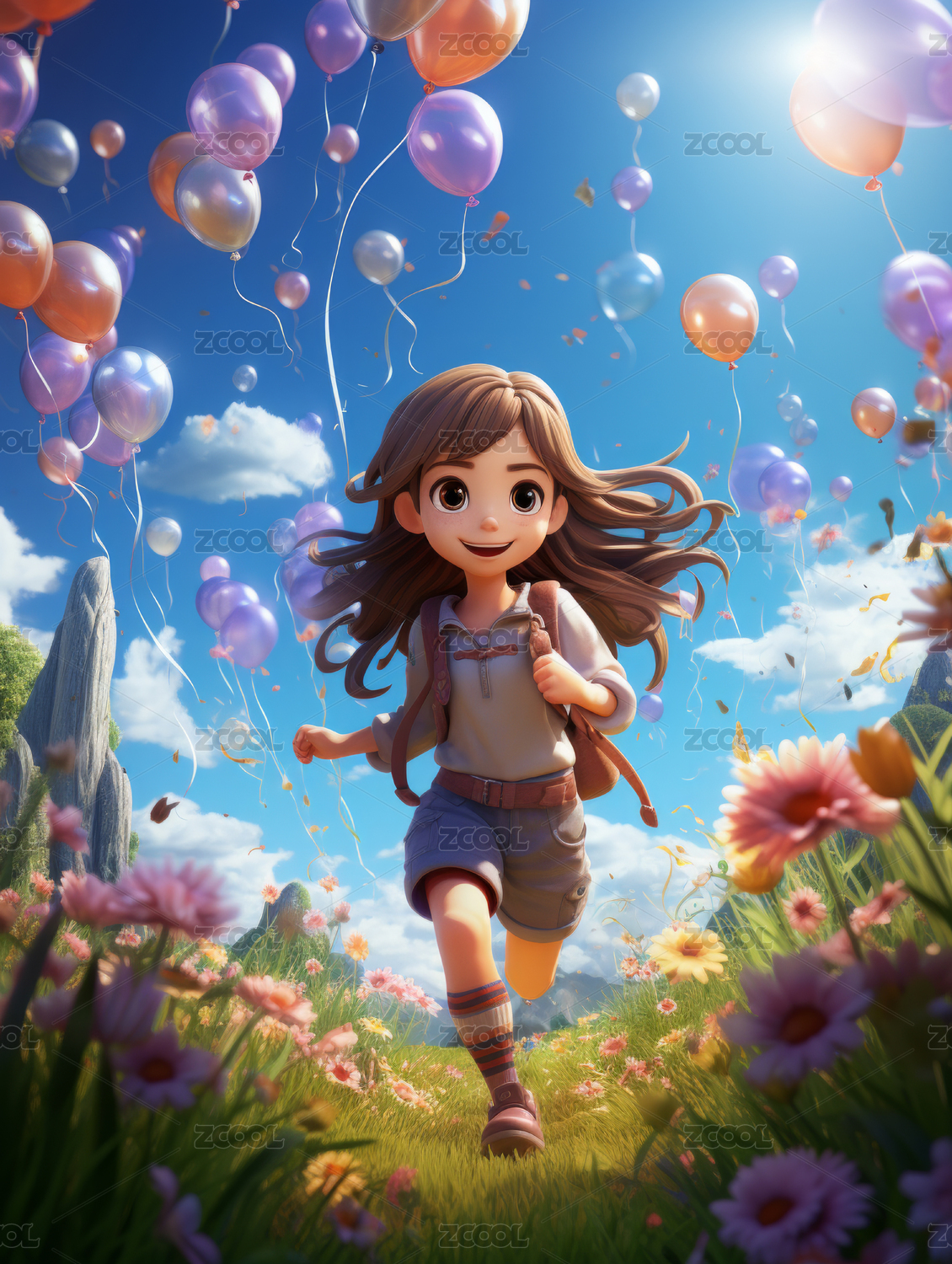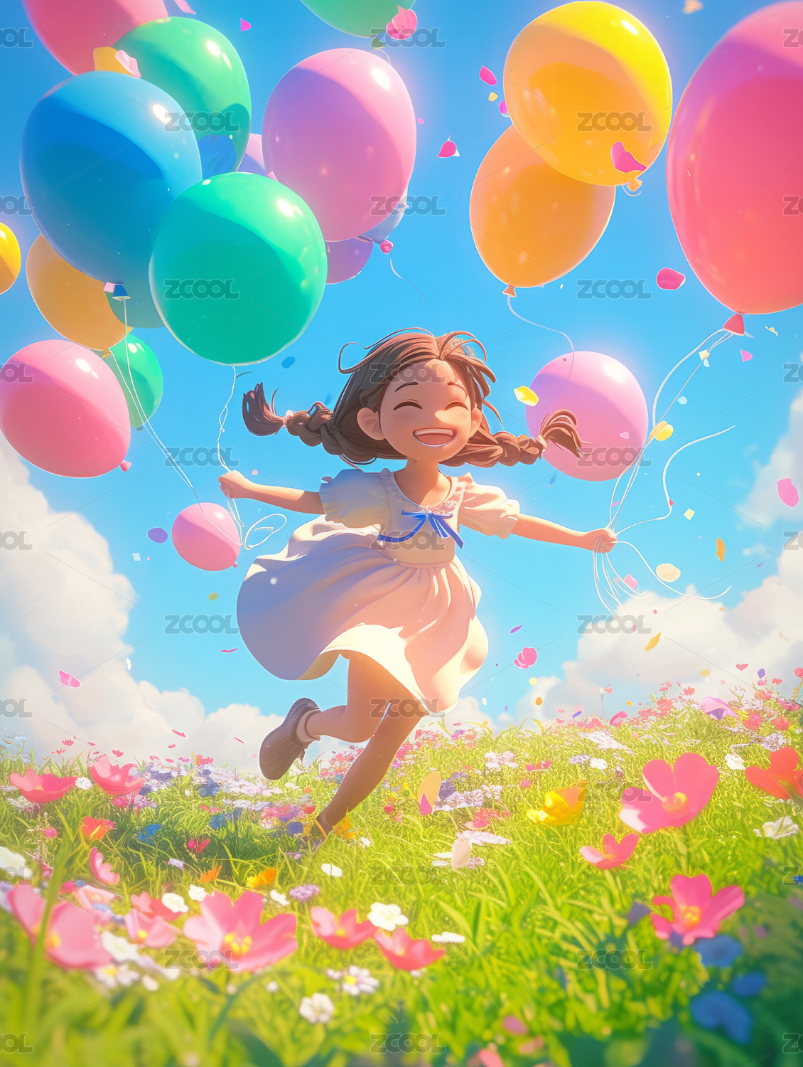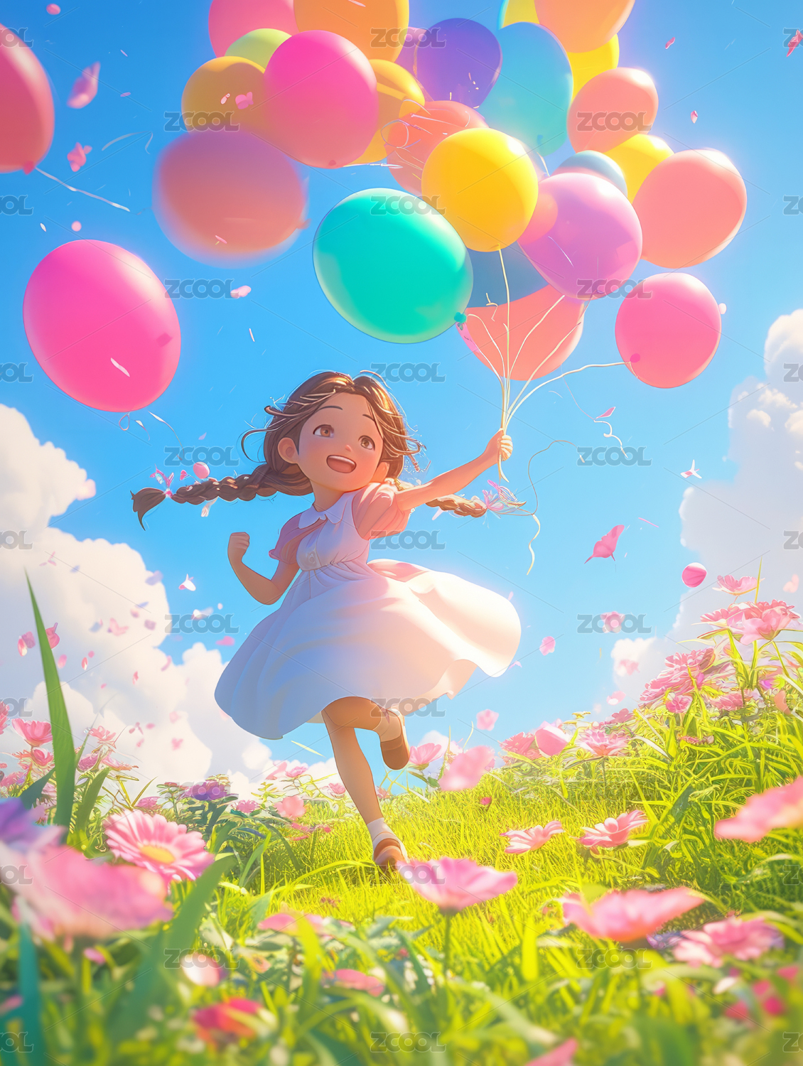 游乐园拿着气球奔跑的可爱卡通女孩插画