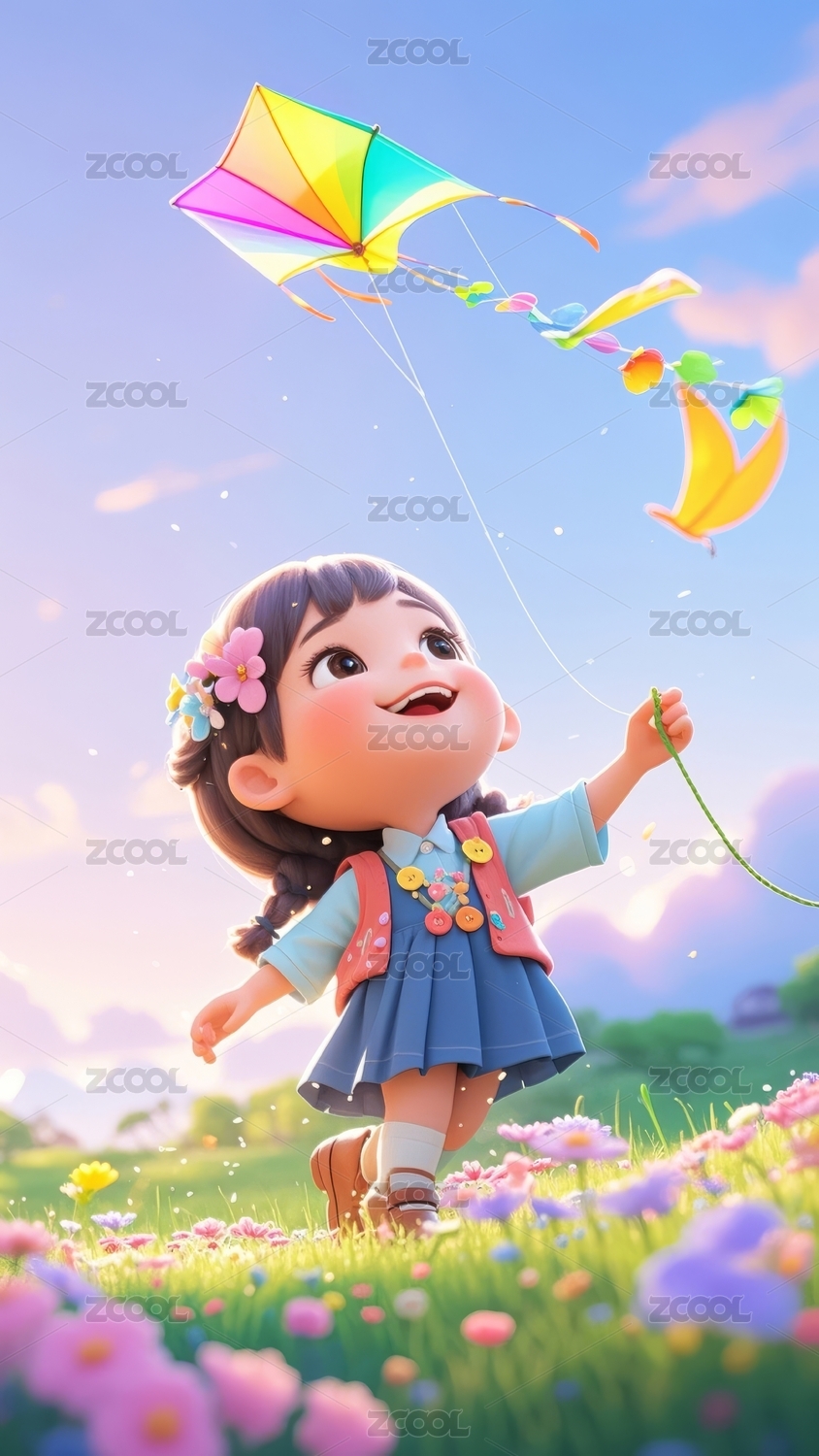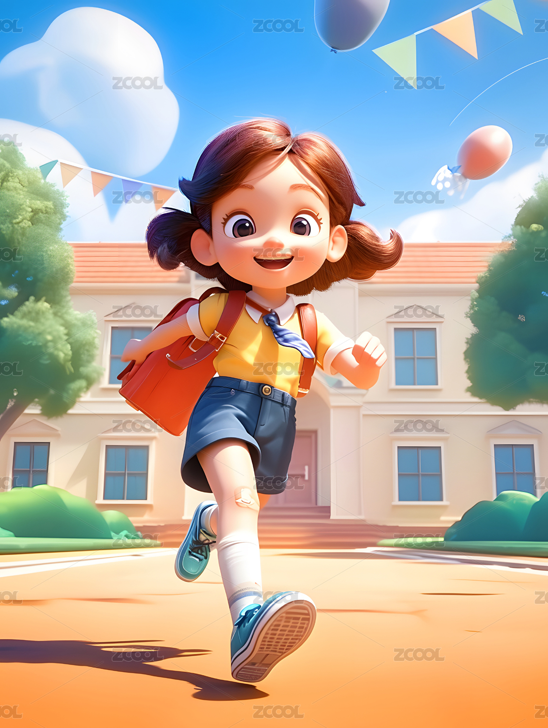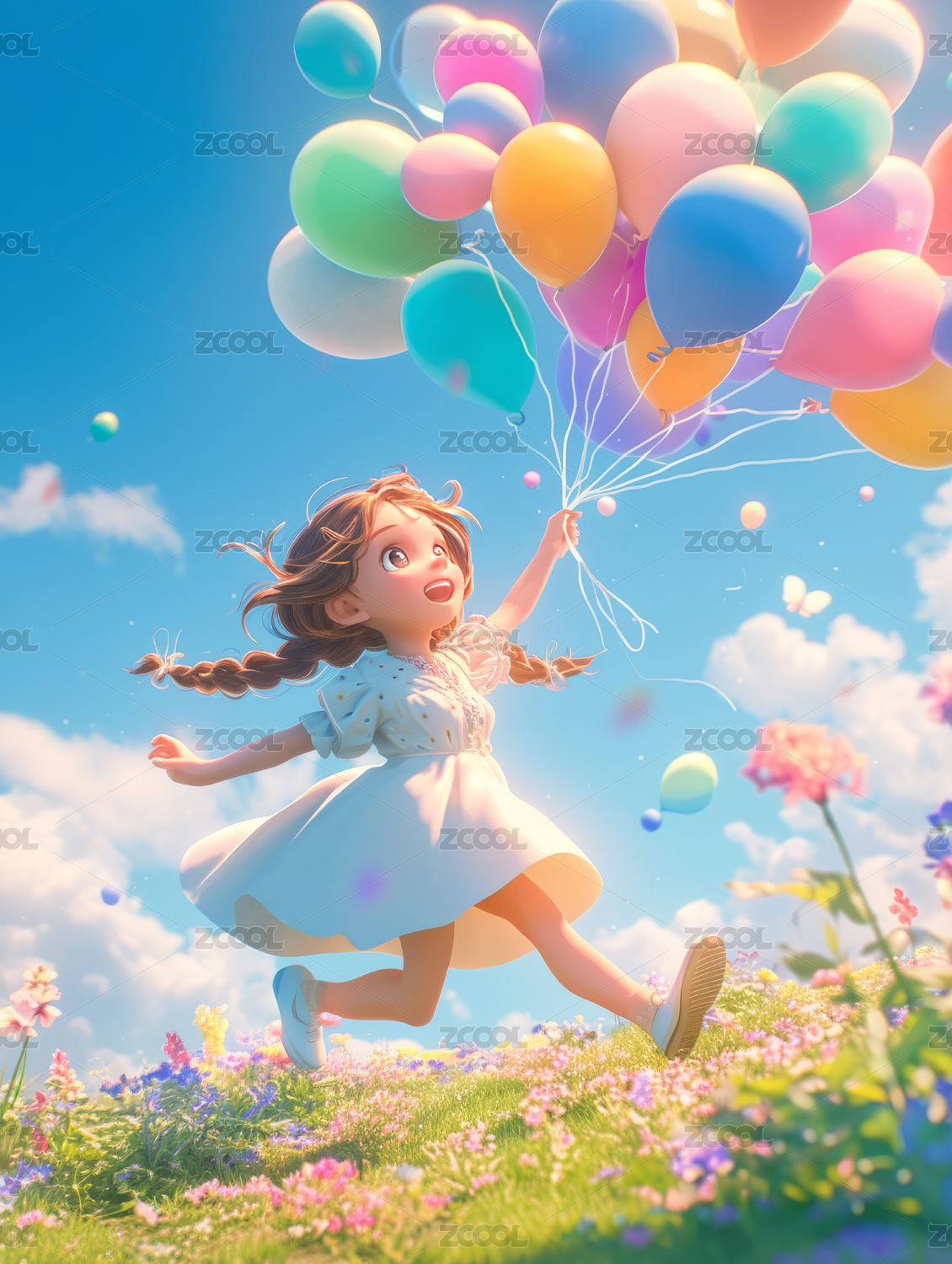 游乐园拿着气球奔跑的可爱卡通女孩插画