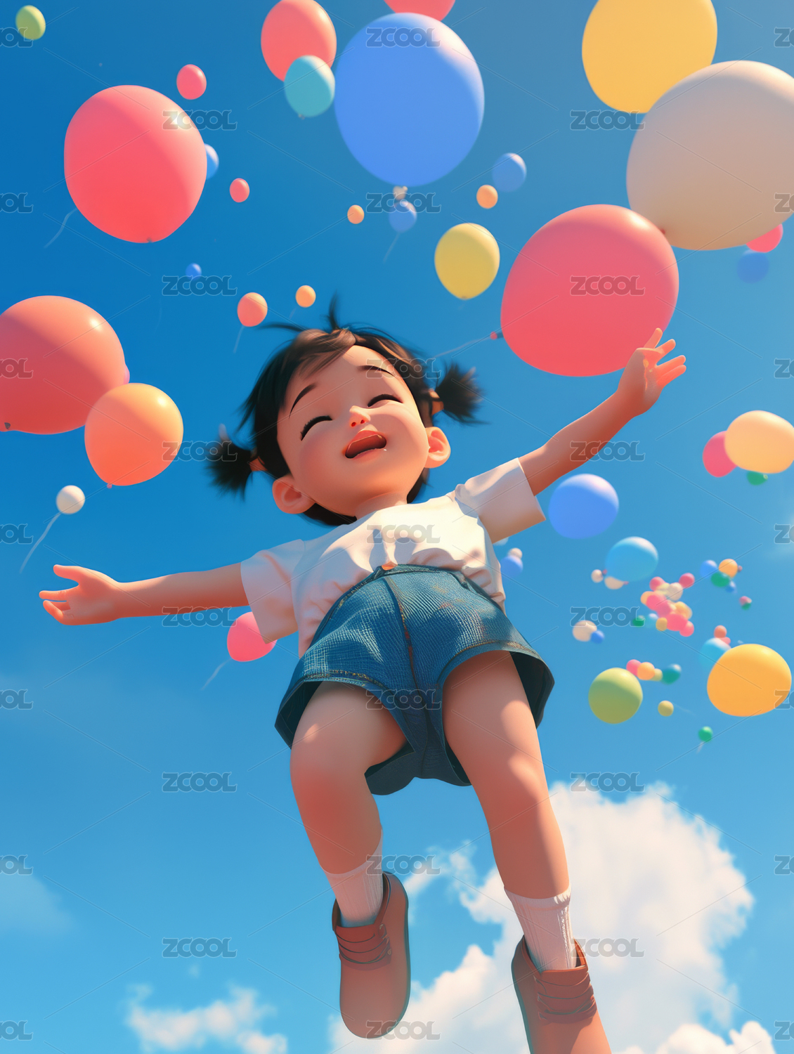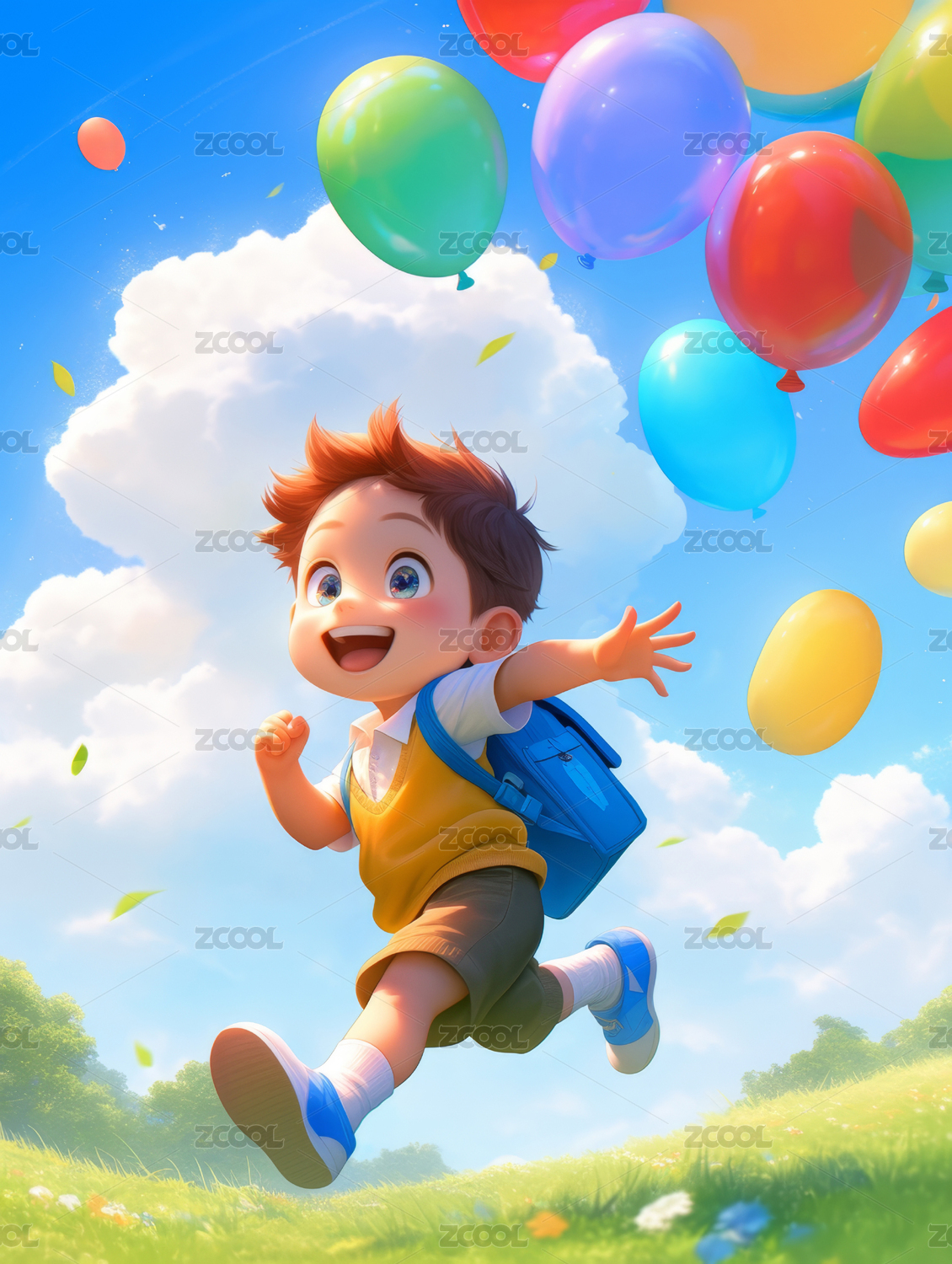 卡通可爱奔跑的男孩天空气球梦幻治愈插画