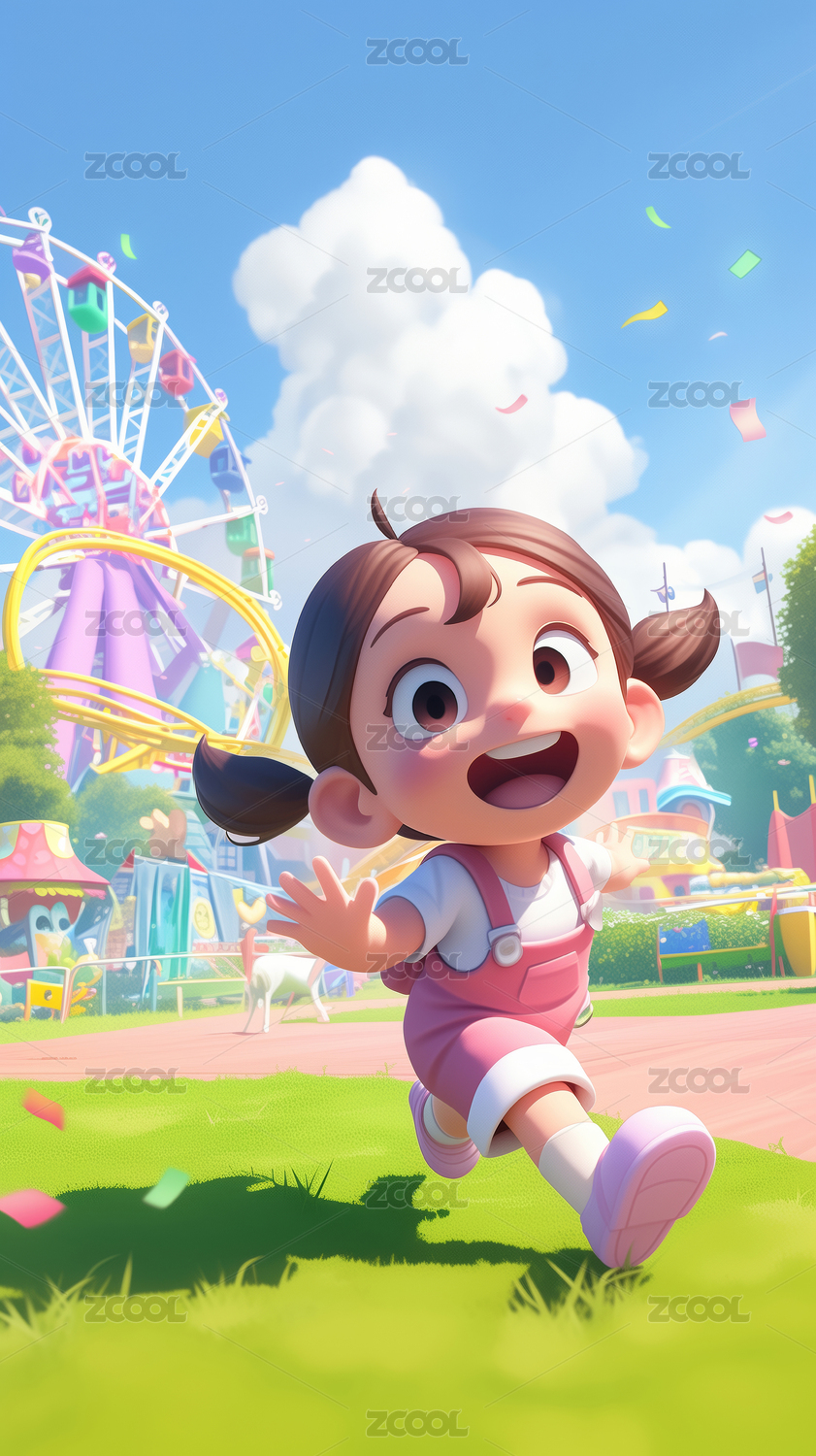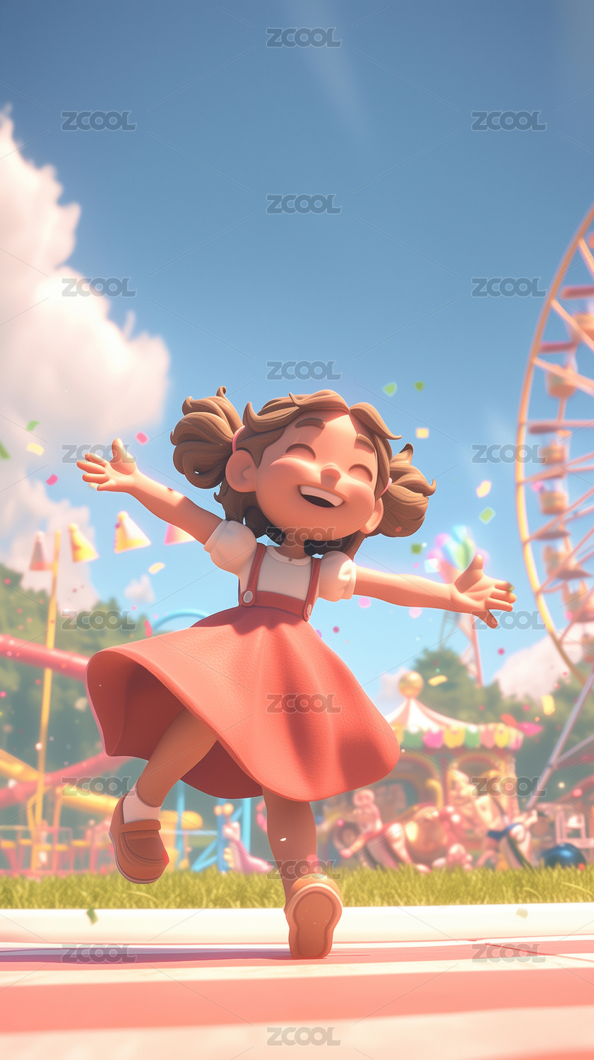 一个可爱的小女孩儿在游乐园高兴地跳起来