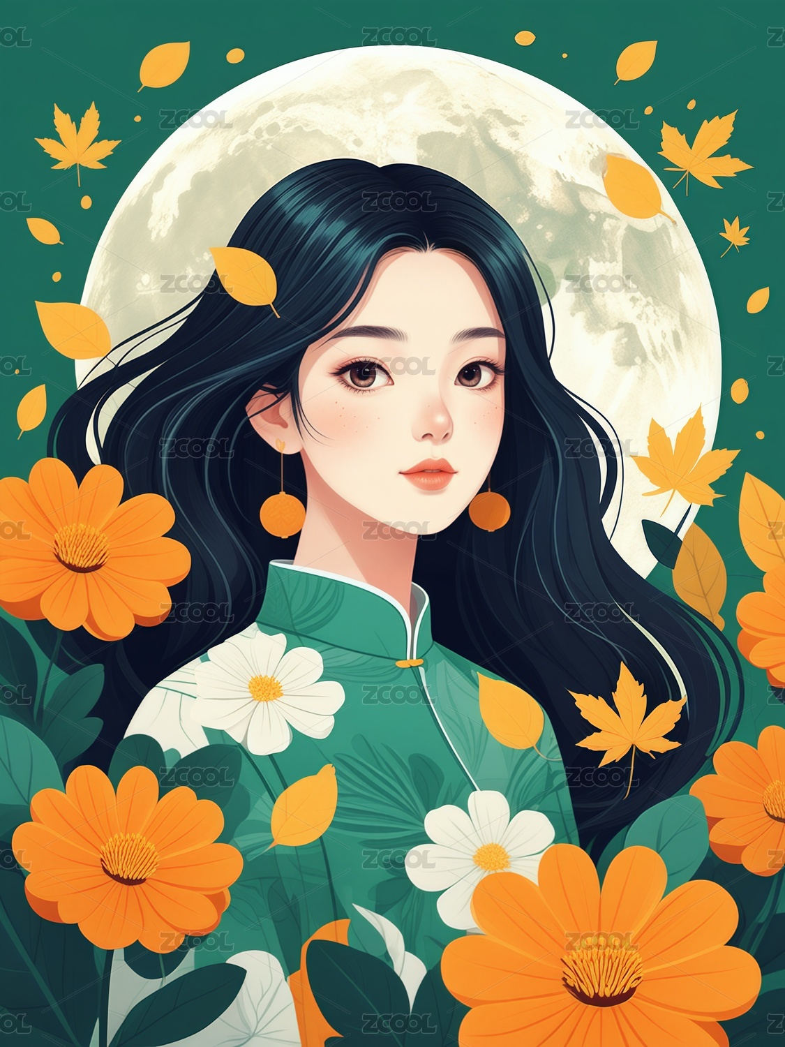 女孩植物花朵扁平化彩色插画