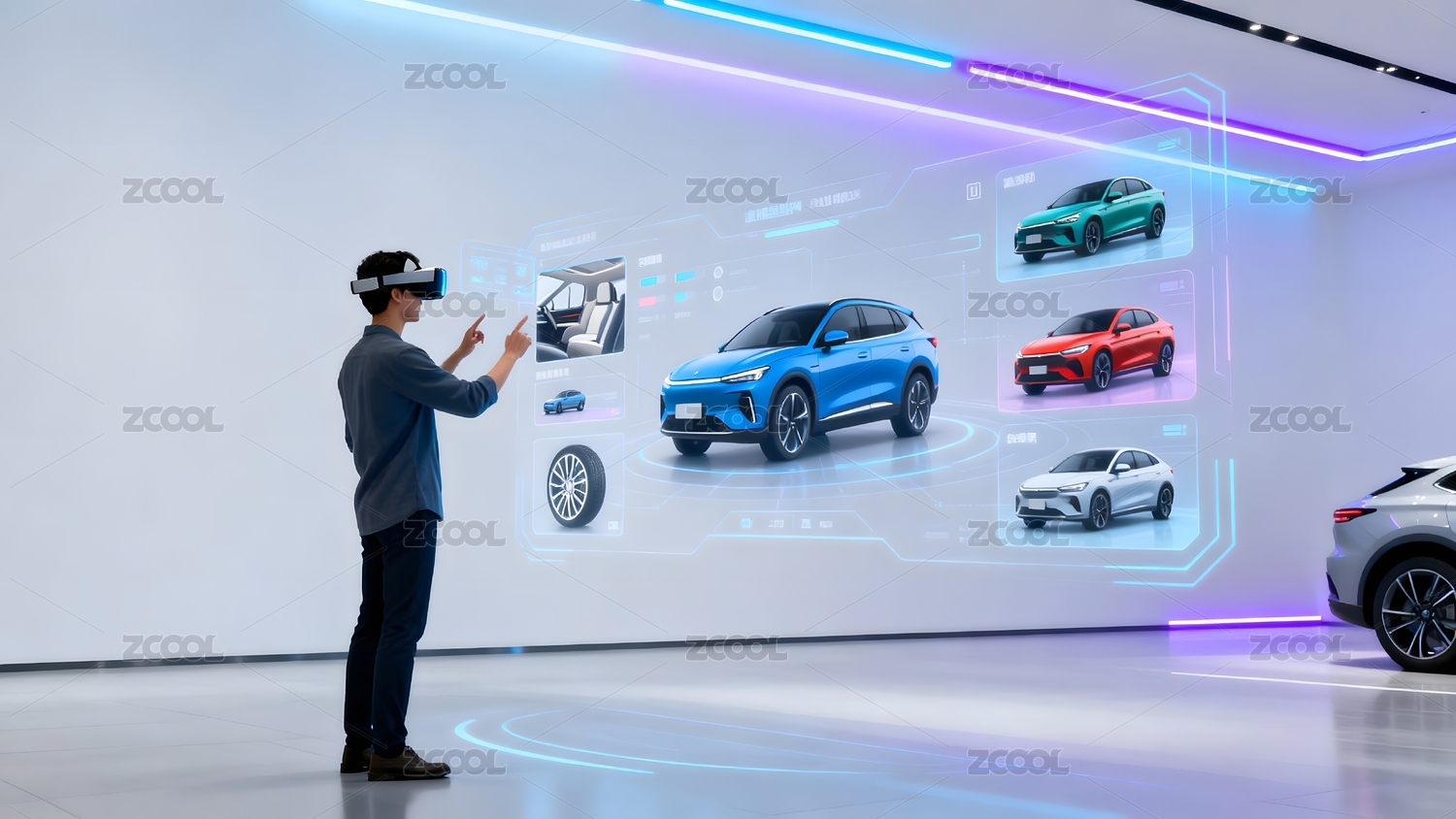 男人,背影,展厅,汽车,屏幕,科技,未来,红色,沙发,灯光