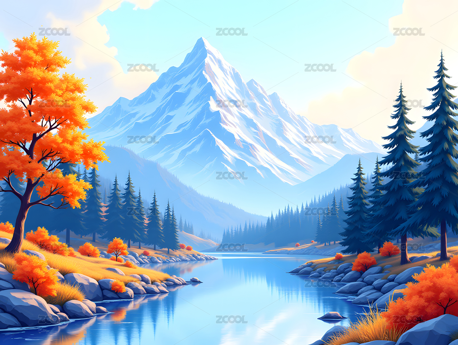 冬季,雪山,森林,树木,黄叶,白雪,山峰,云雾,河流,倒影