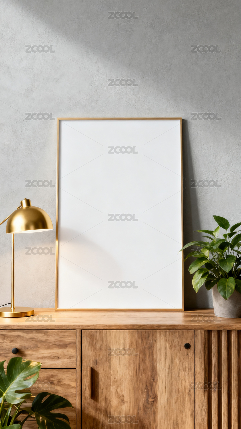 木质柜上空白画框与绿植