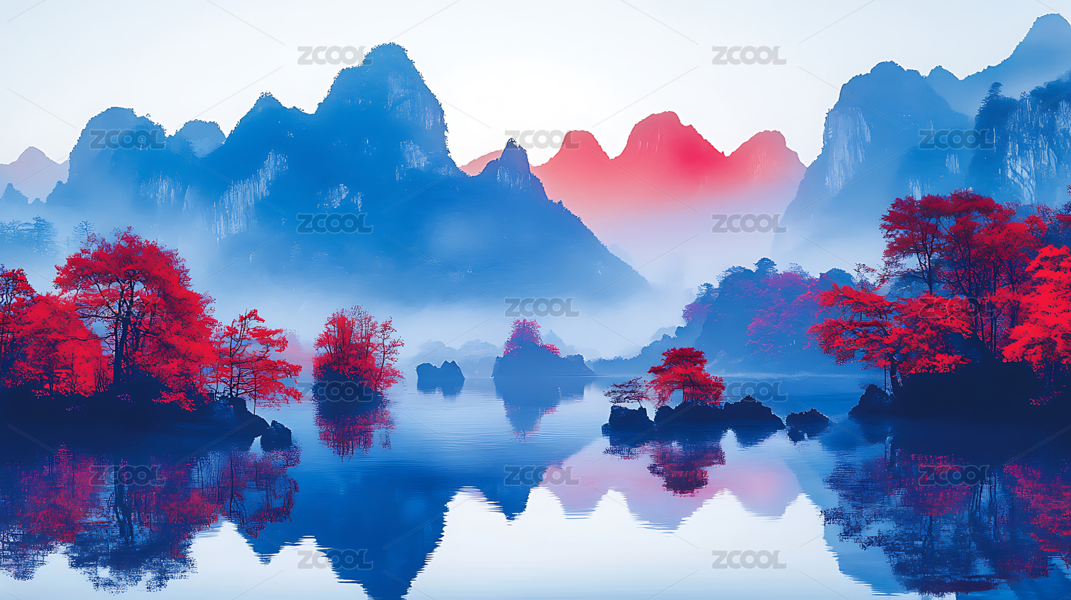 水墨山水间的绽放荷花