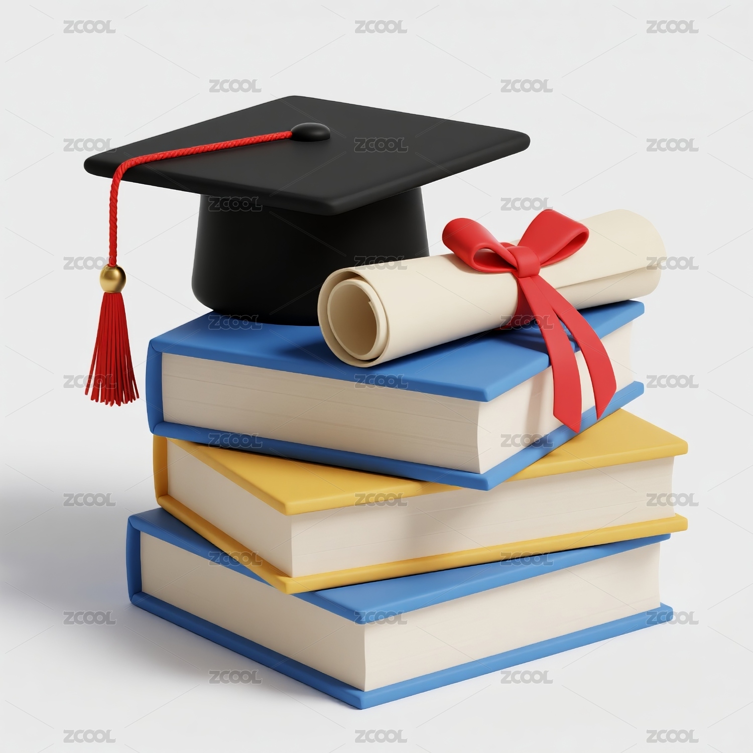 毕业帽放置在堆放着彩色书籍上
