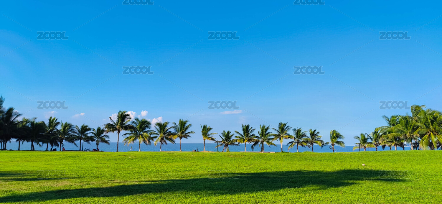 中国广东深圳深圳湾草坪椰树蓝天白云海边