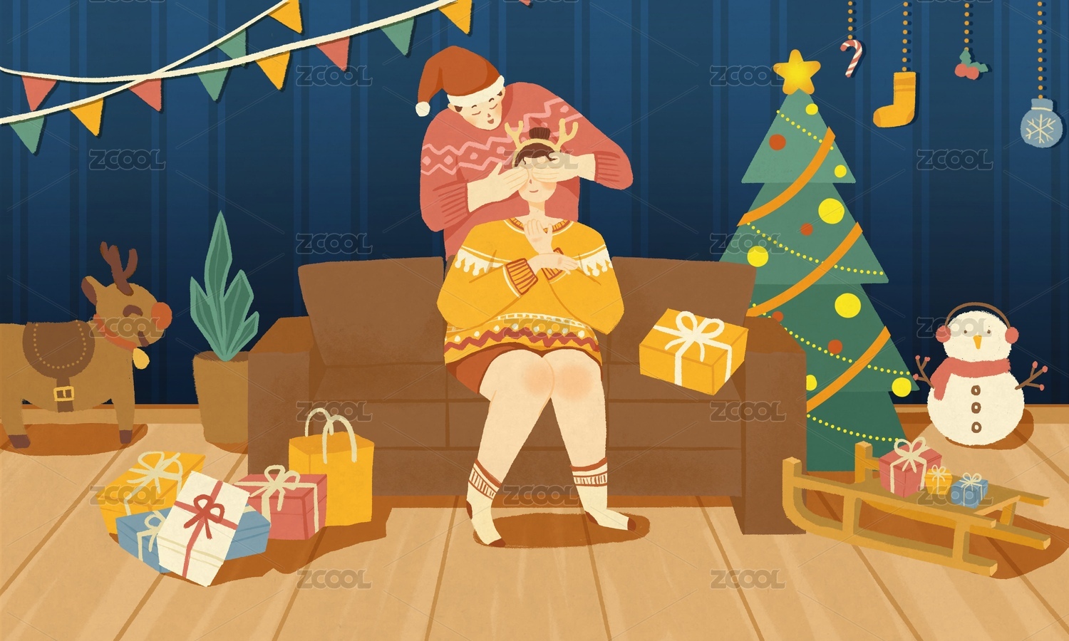 圣诞,圣诞老人,小女孩,麋鹿,圣诞树,插画