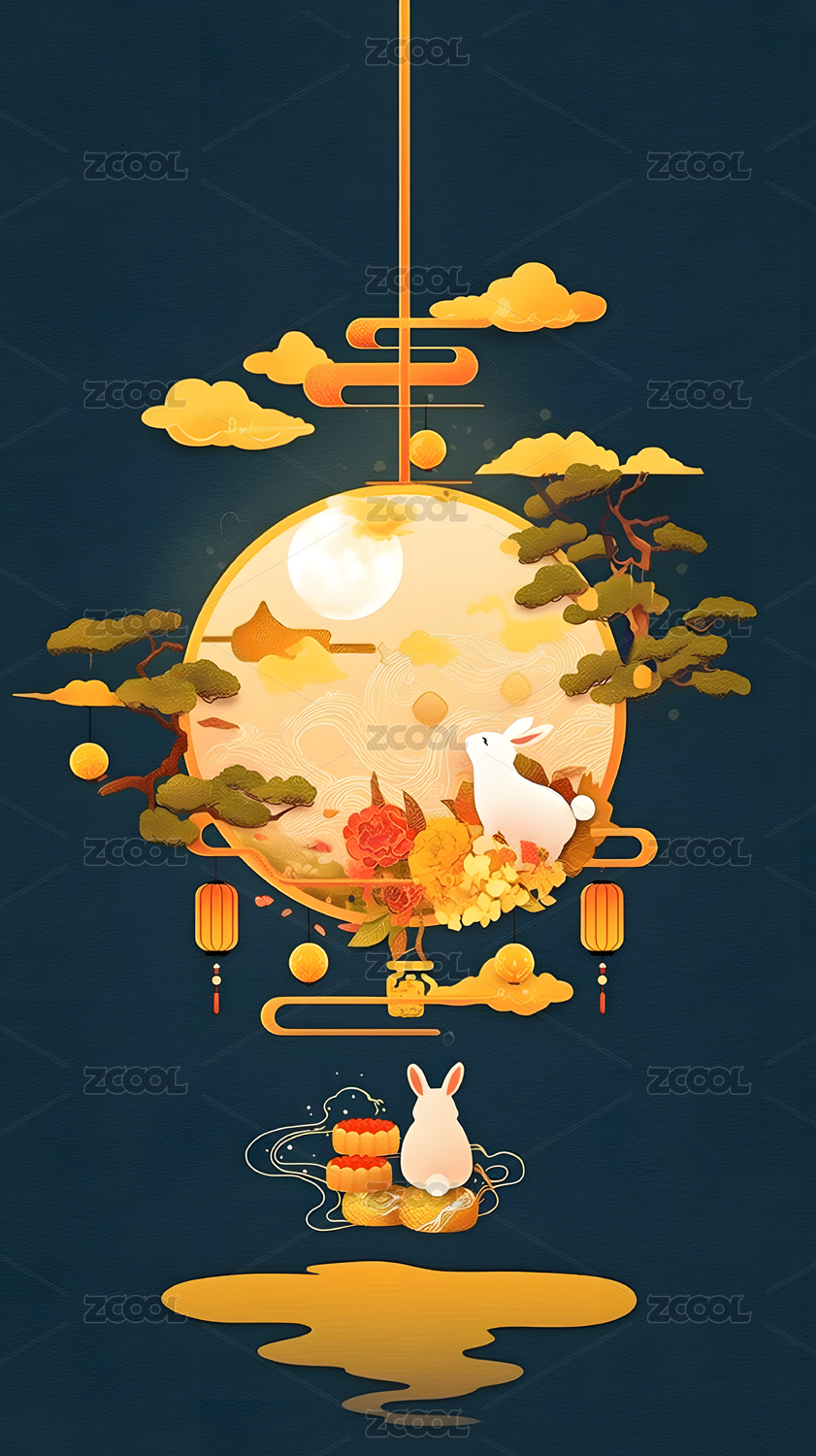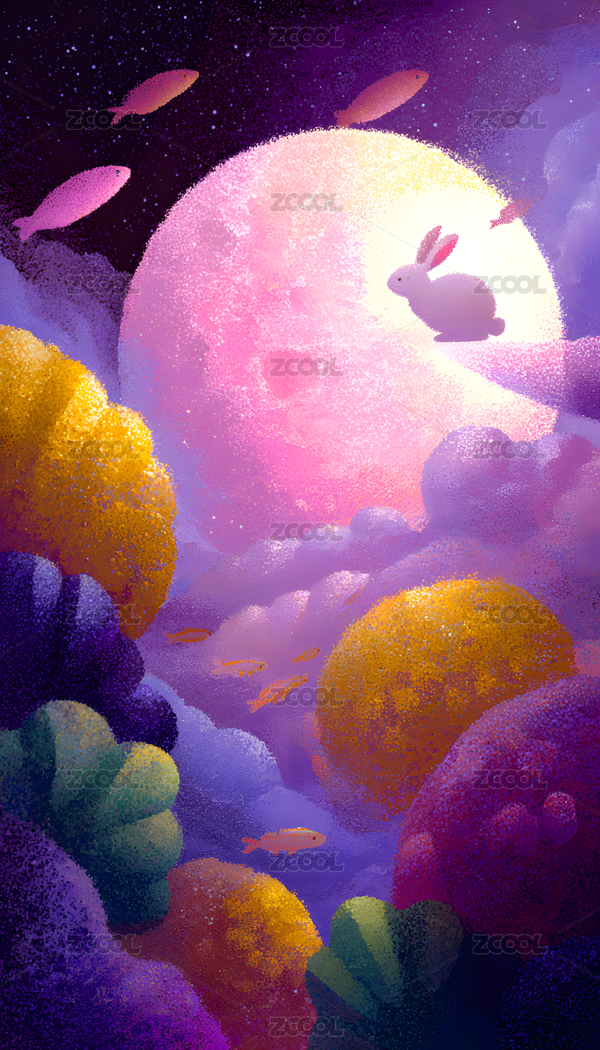 中秋节创意插画,中秋节,创意插画,玉兔,祥云,月桂树,圆月,青山