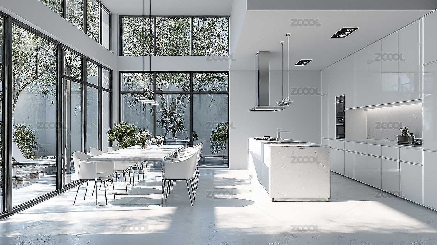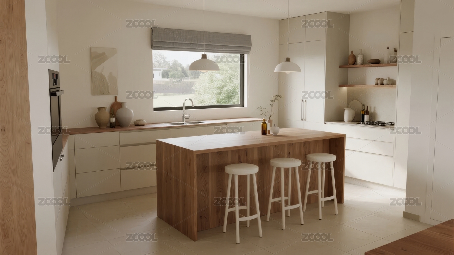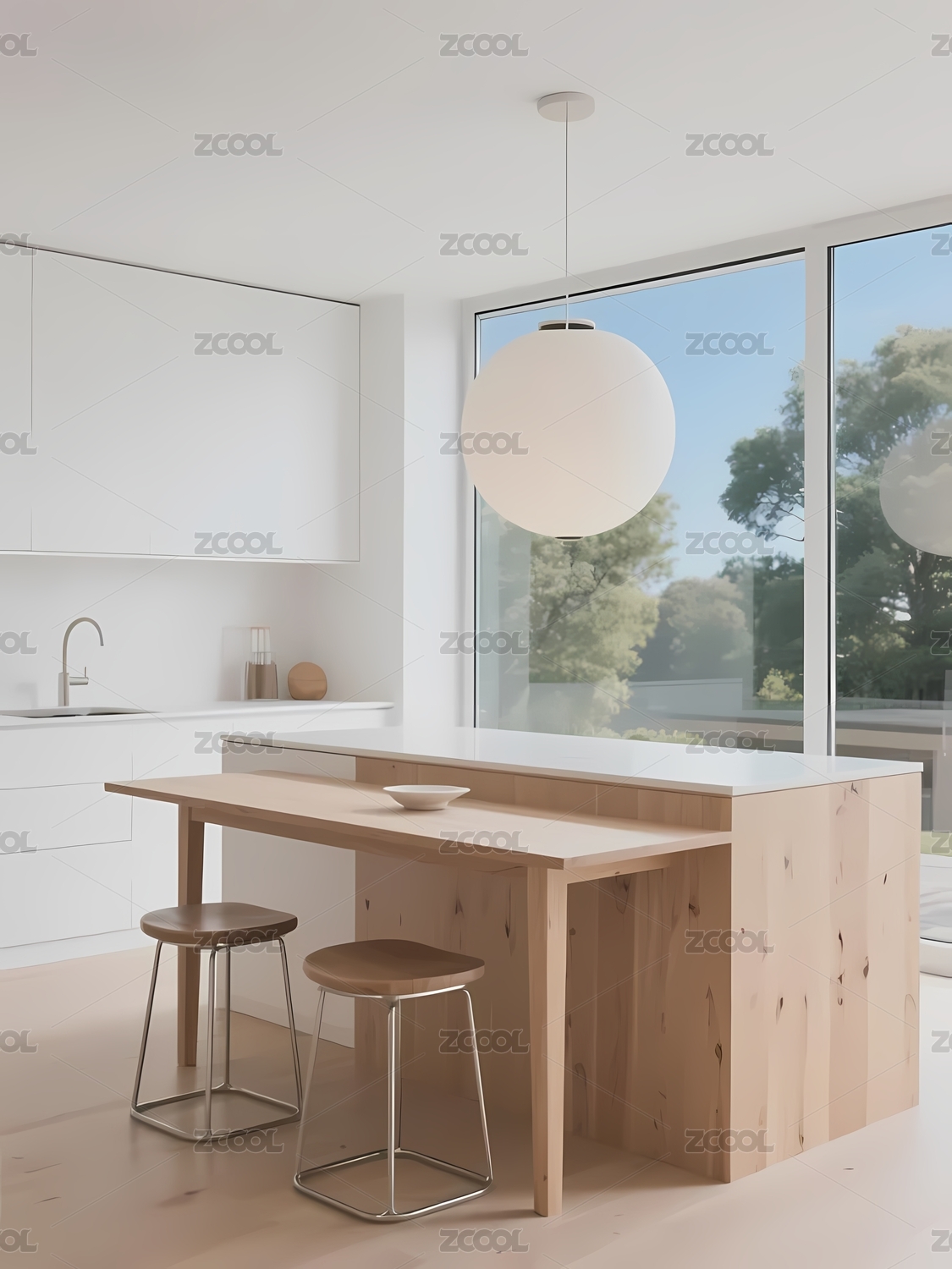 现代简约厨房木质岛台与落地窗设计