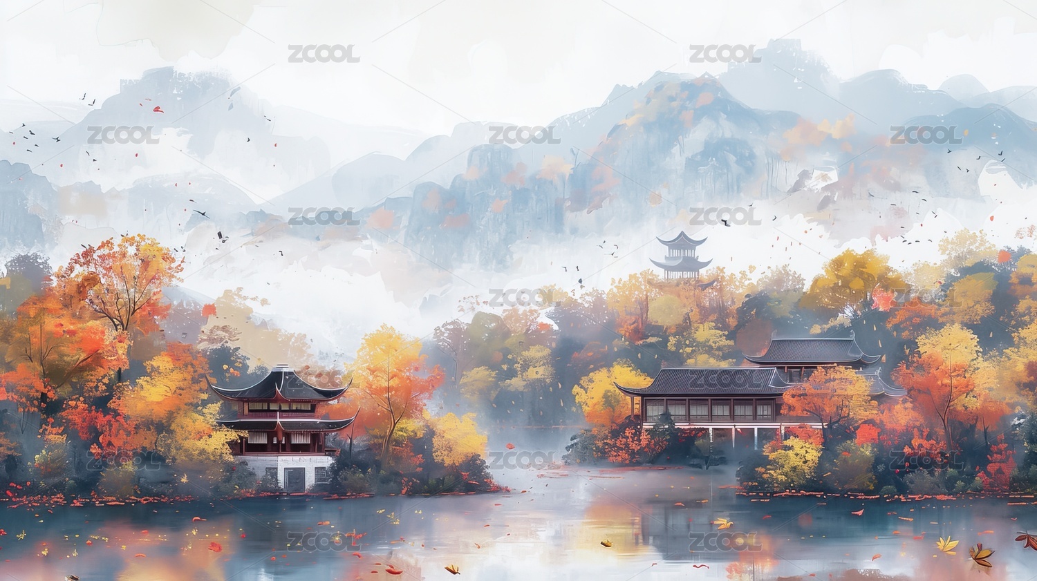 秋意浓浓山水画卷,亭台楼阁尽显东方韵味