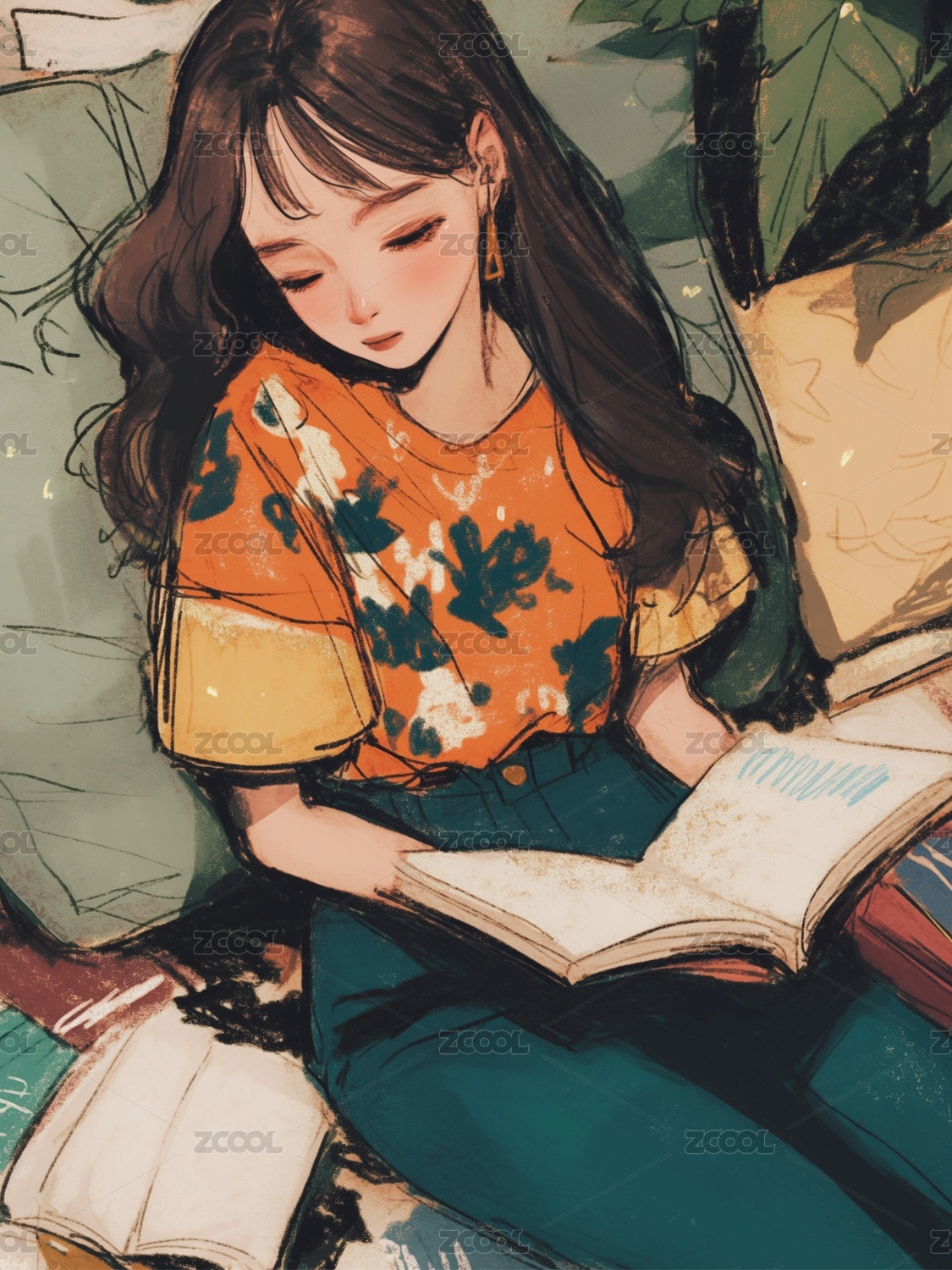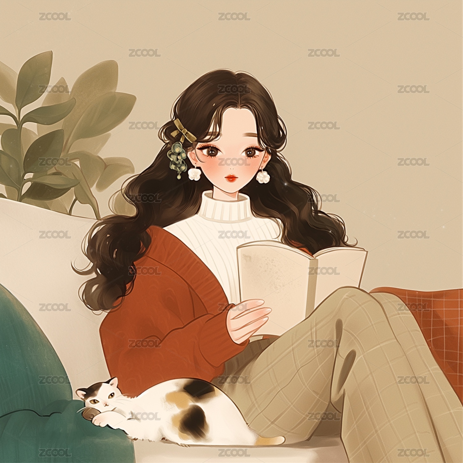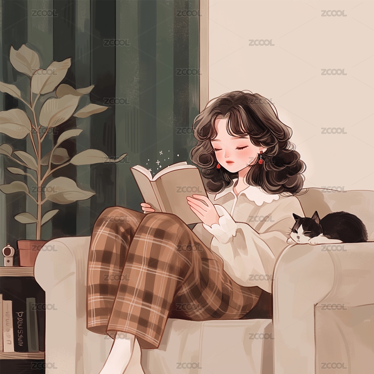 慵懒的女孩坐在沙发上看书,都市丽人背景