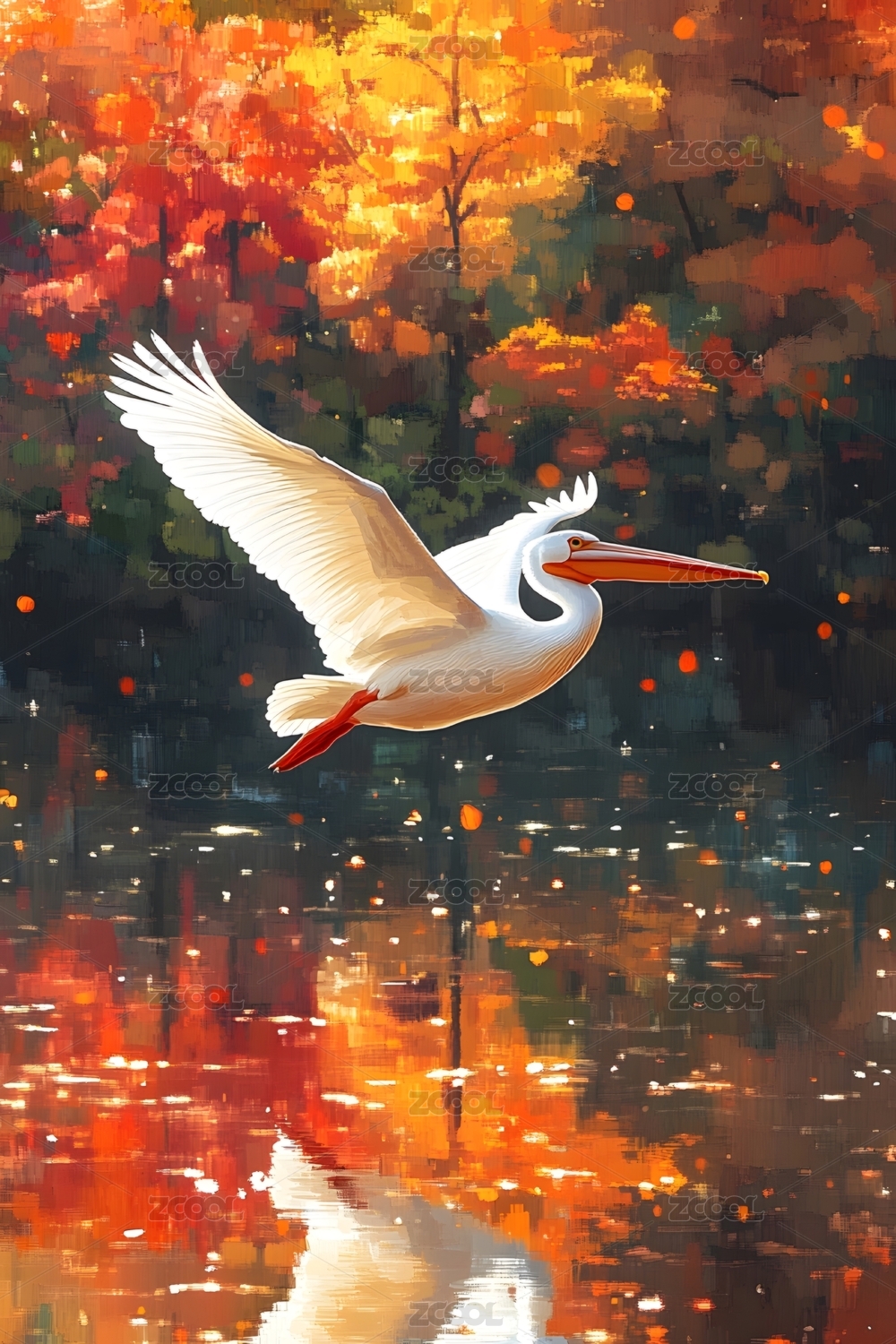 秋日湖面上展翅飞翔的洁白鹈鹕