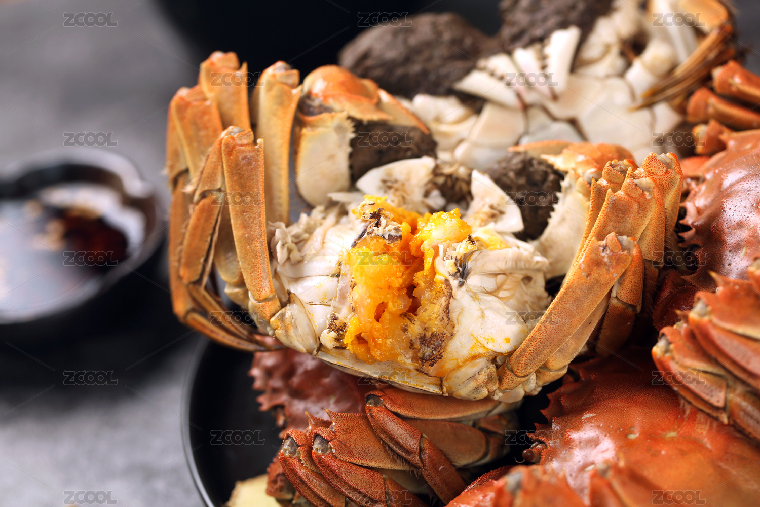 蒸熟剥开的大闸蟹蟹肉蟹黄蟹膏特写