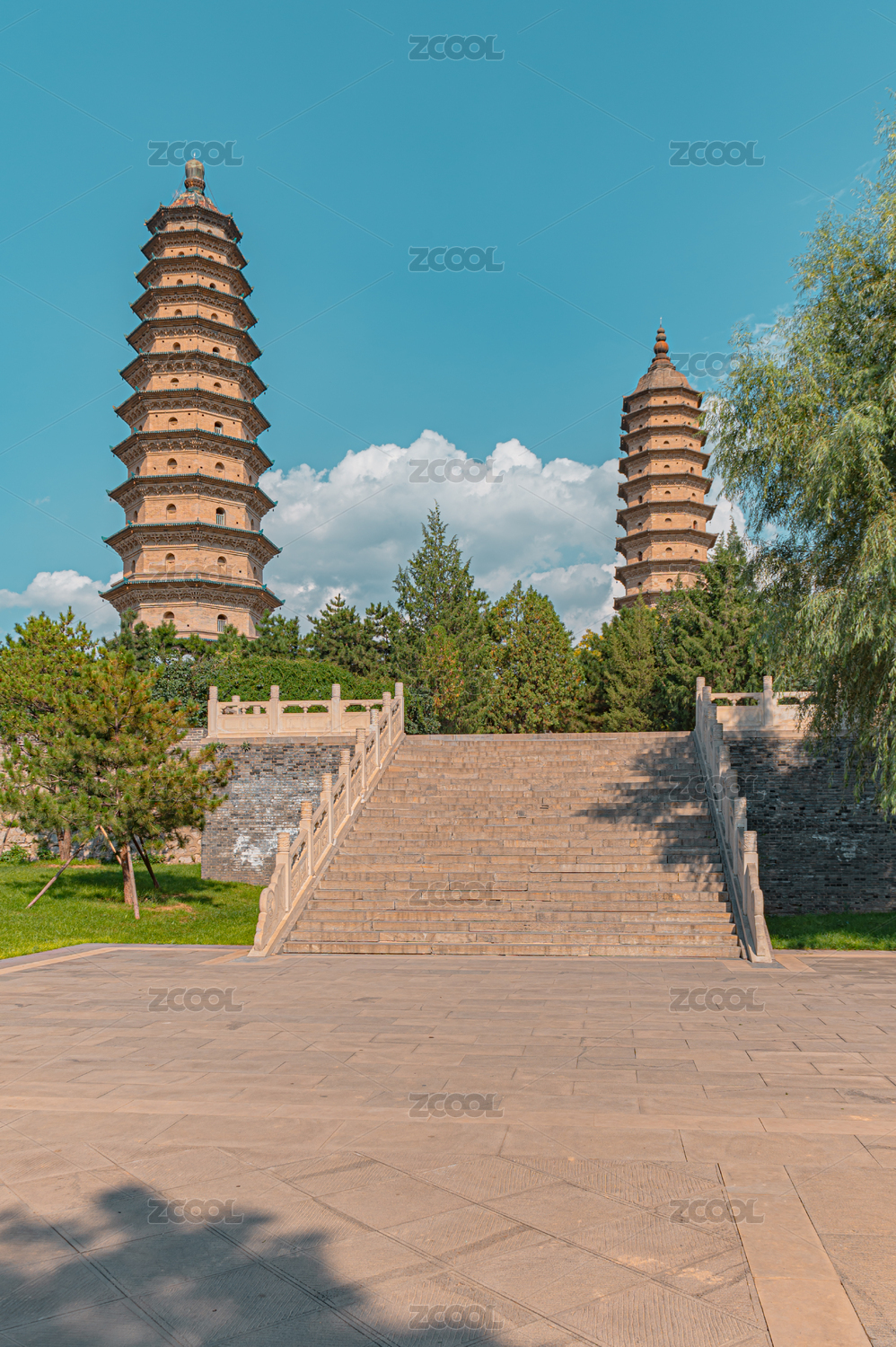 永祚寺又称双塔寺,蓝天白云太阳光照亮高塔