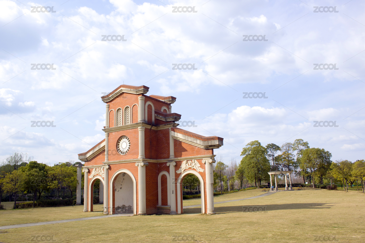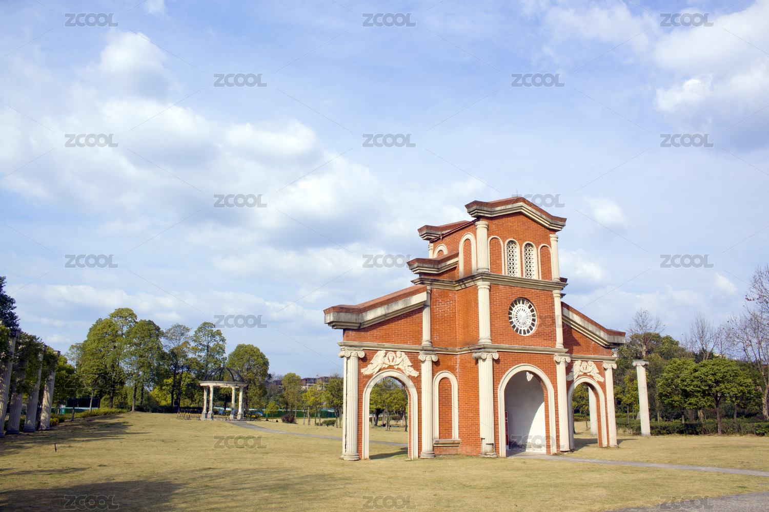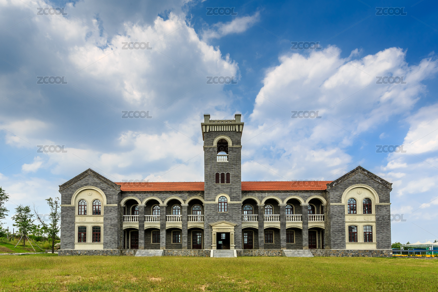 齐鲁酒地风景区的欧式建筑与蓝天白云草场