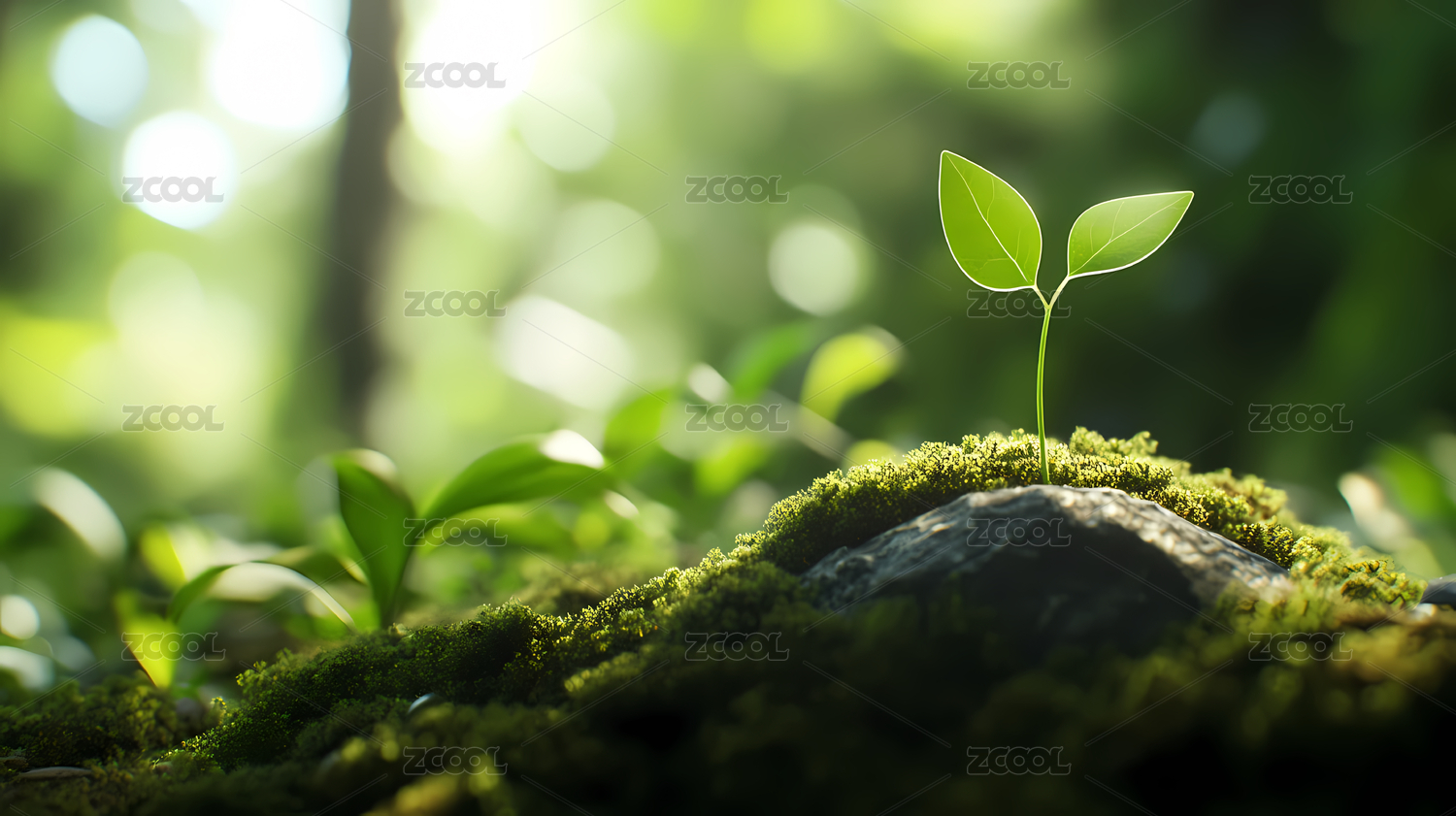 春季苔藓上的植物生长的景象
