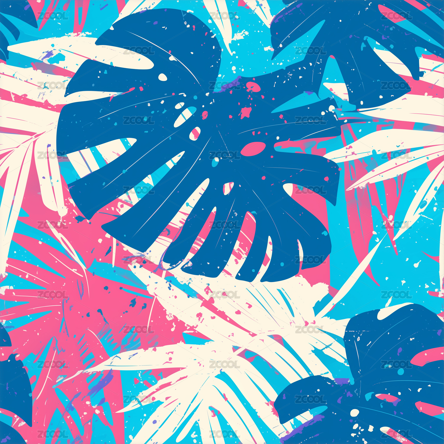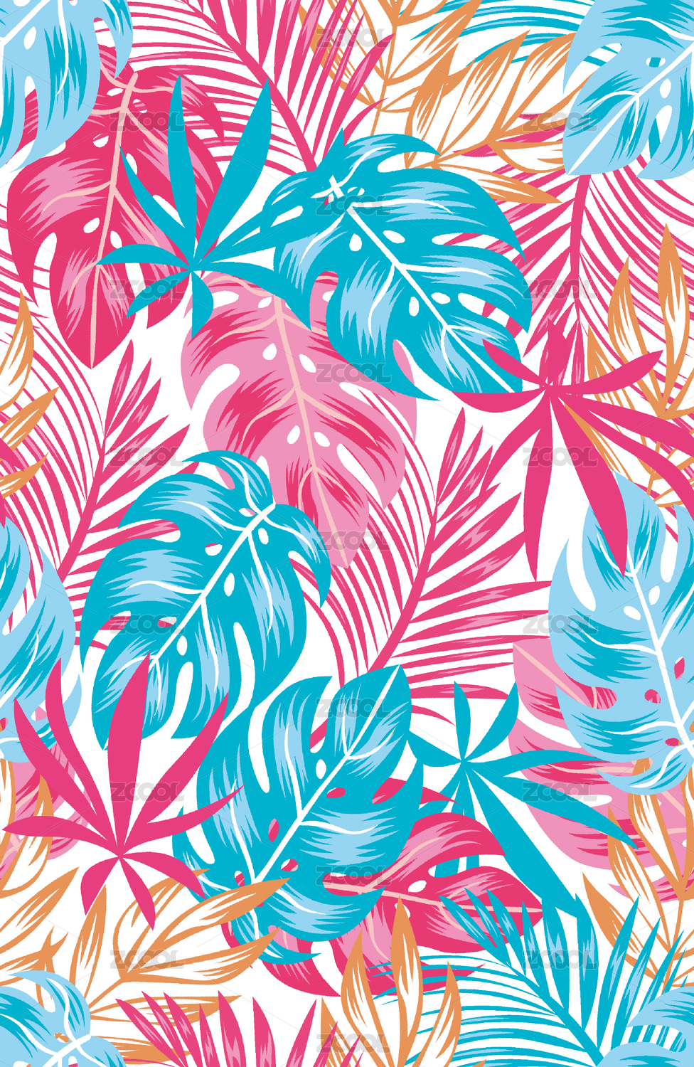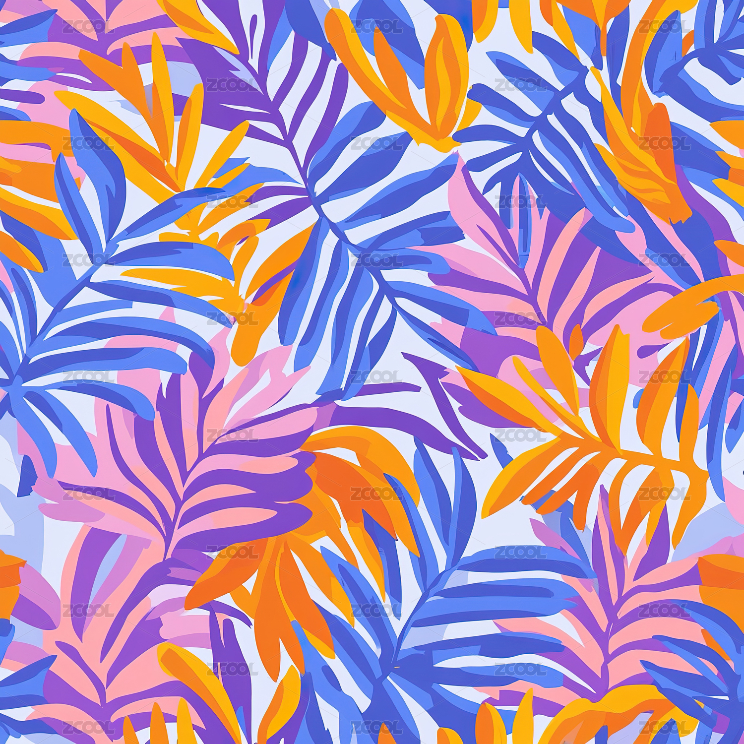 夏天彩色植物叶子四方连续循环无缝拼贴图案