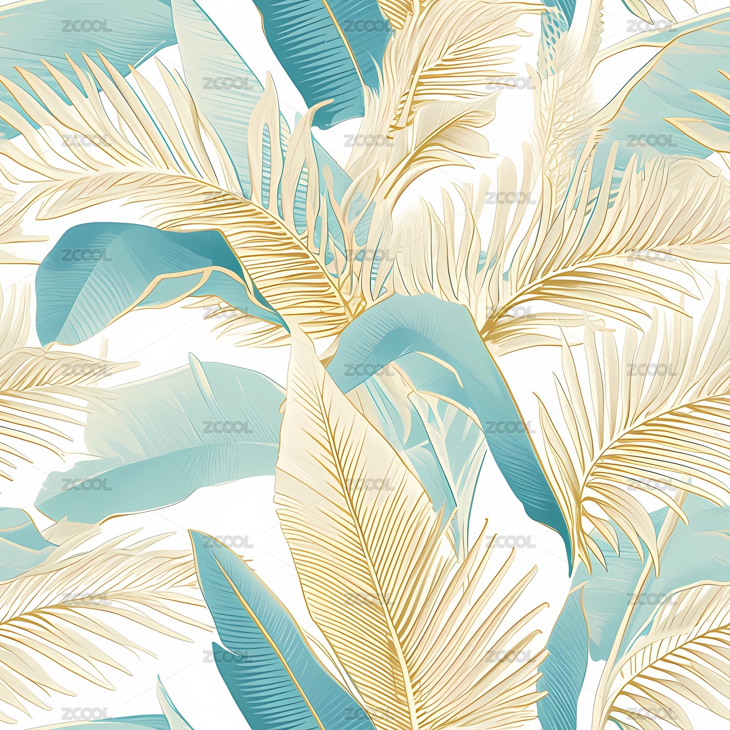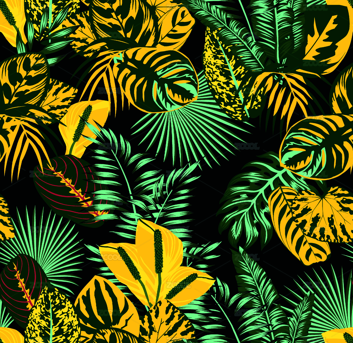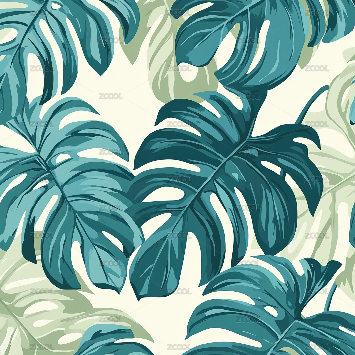 夏天彩色植物叶子四方连续循环无缝拼贴图案